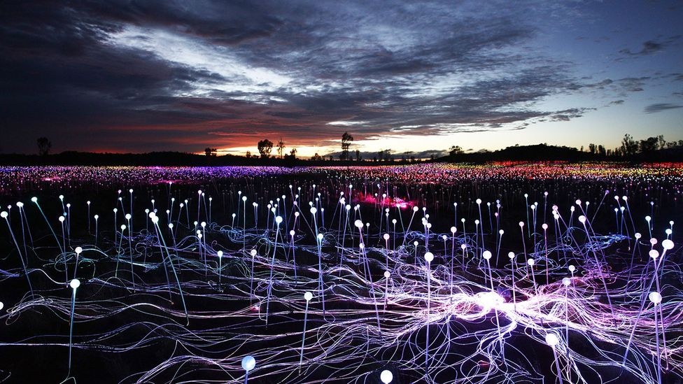 Ảnh: BBC Một địa điểm khác bạn không nên bỏ lỡ khi đến đây là Cánh đồng ánh sáng của nghệ sĩ Bruce Munro, một trong những tác phẩm nghệ thuật sắp đặt lớn nhất trong lịch sử của Australia. Hơn 50.000 trục xoay ánh sáng biến nền sa mạc thành một khu vườn đa sắc vào ban đêm.