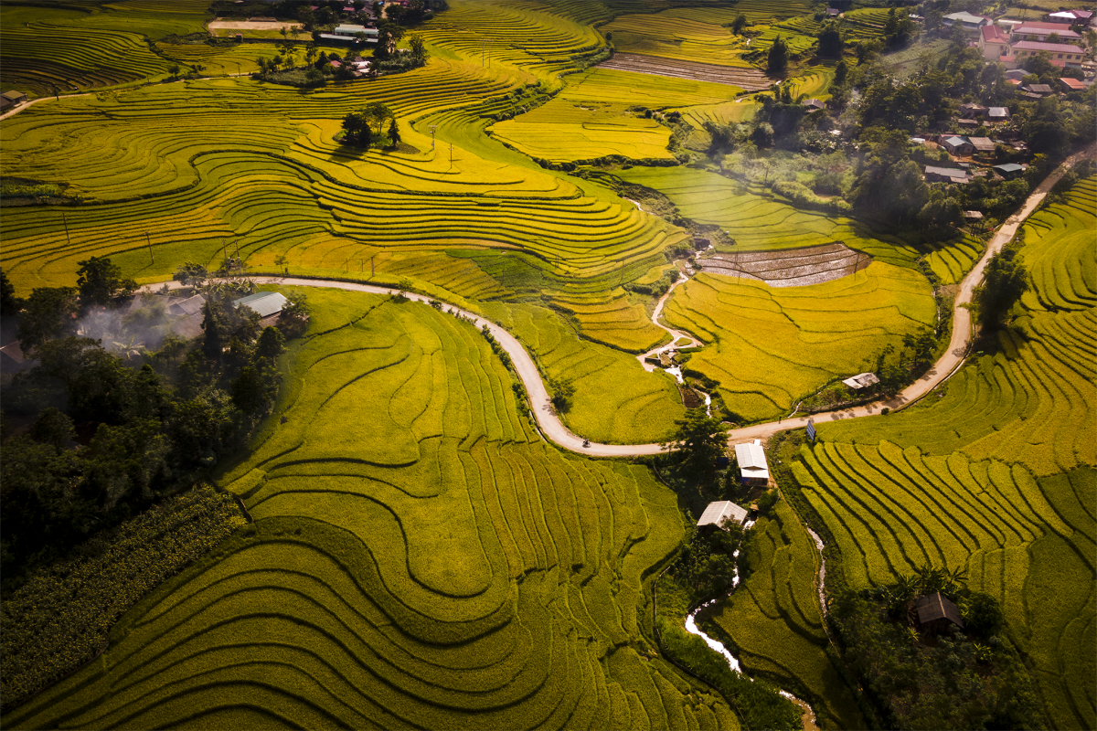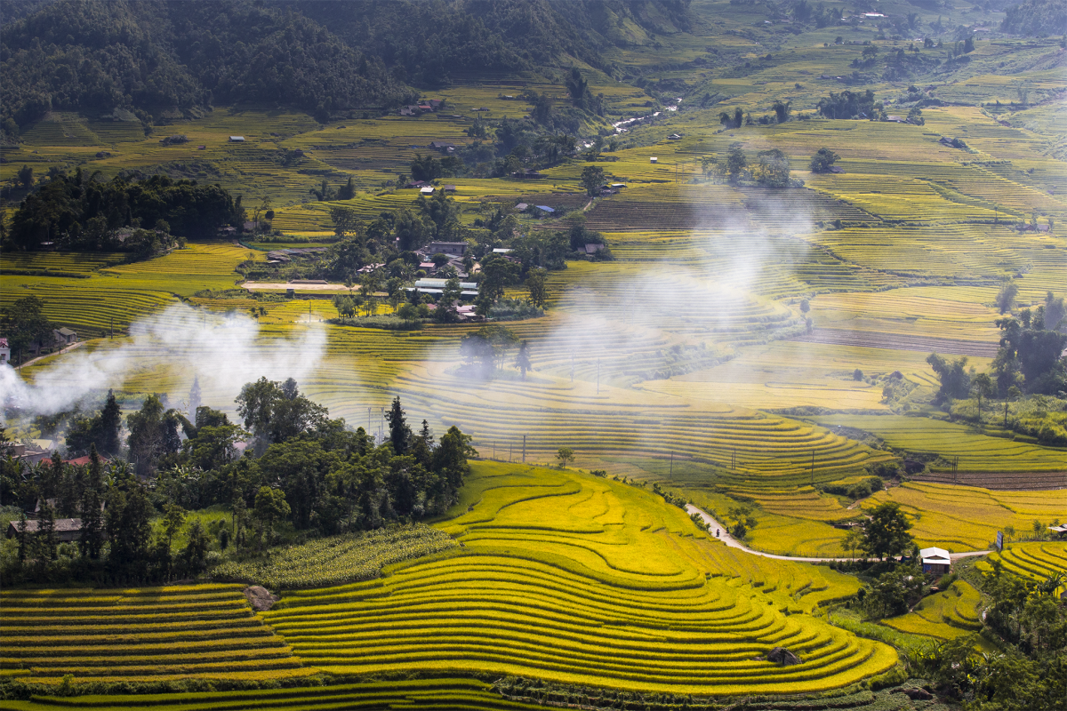 Địa hình được chia cắt mạnh mẽ với nhiều vực sâu, cùng với nghề trồng lúa đã biến nơi đây thành thung lũng của những ruộng bậc thang uốn lượn, được bao bọc bởi các ngọn núi cao hùng vĩ. Thung lũng rộng lớn bao phủ trong sắc vàng khiến những cánh đồng lúa như kéo dài bất tận.