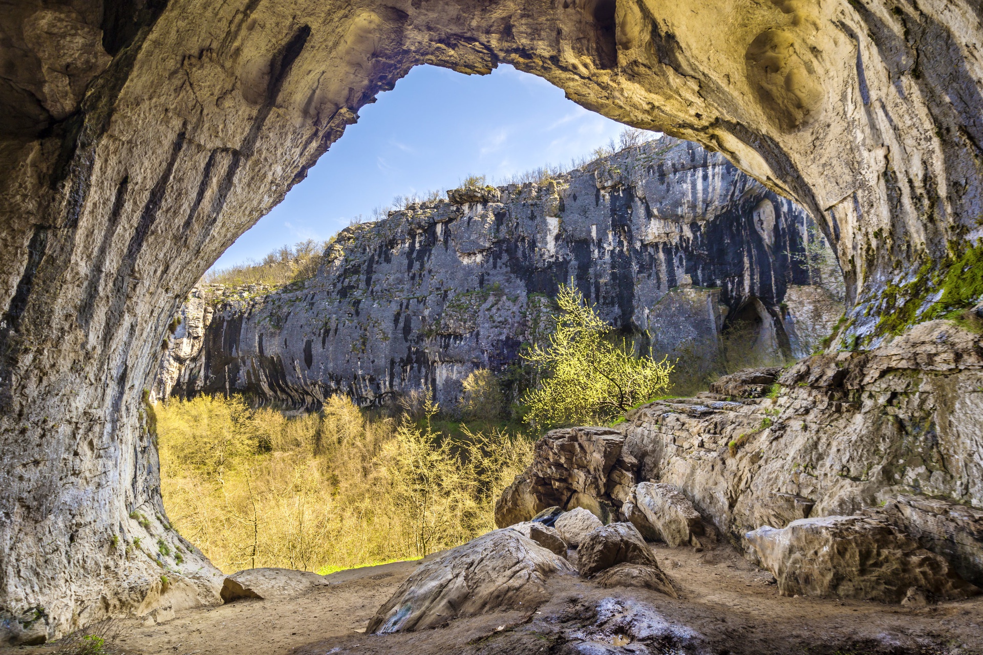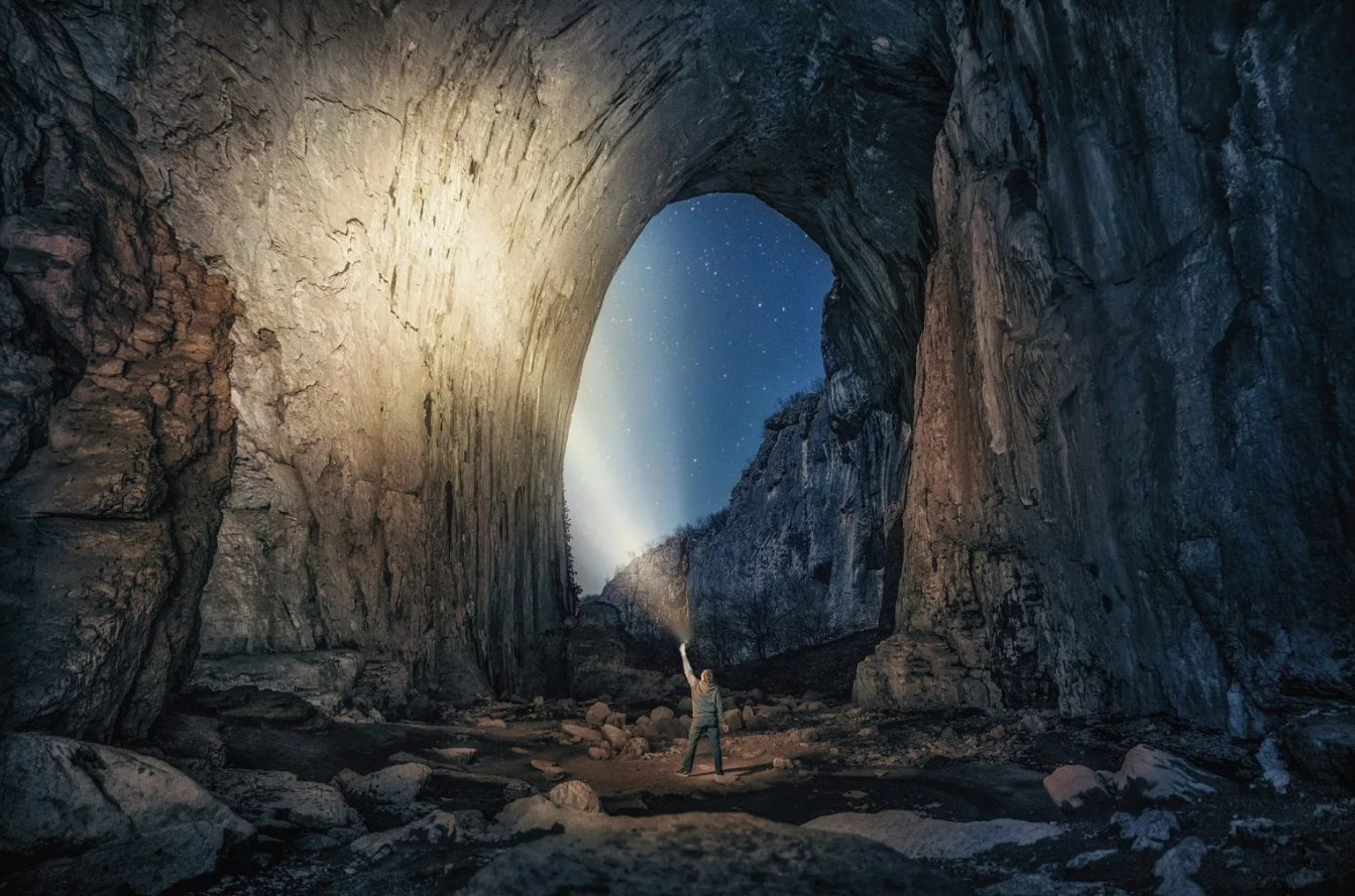 Ánh sáng rọi qua 2 lỗ hổng lớn, chiếu thẳng vào hang động Prohodna tạo nên một khung cảnh huyền bí, thu hút du khách đến khám phá.