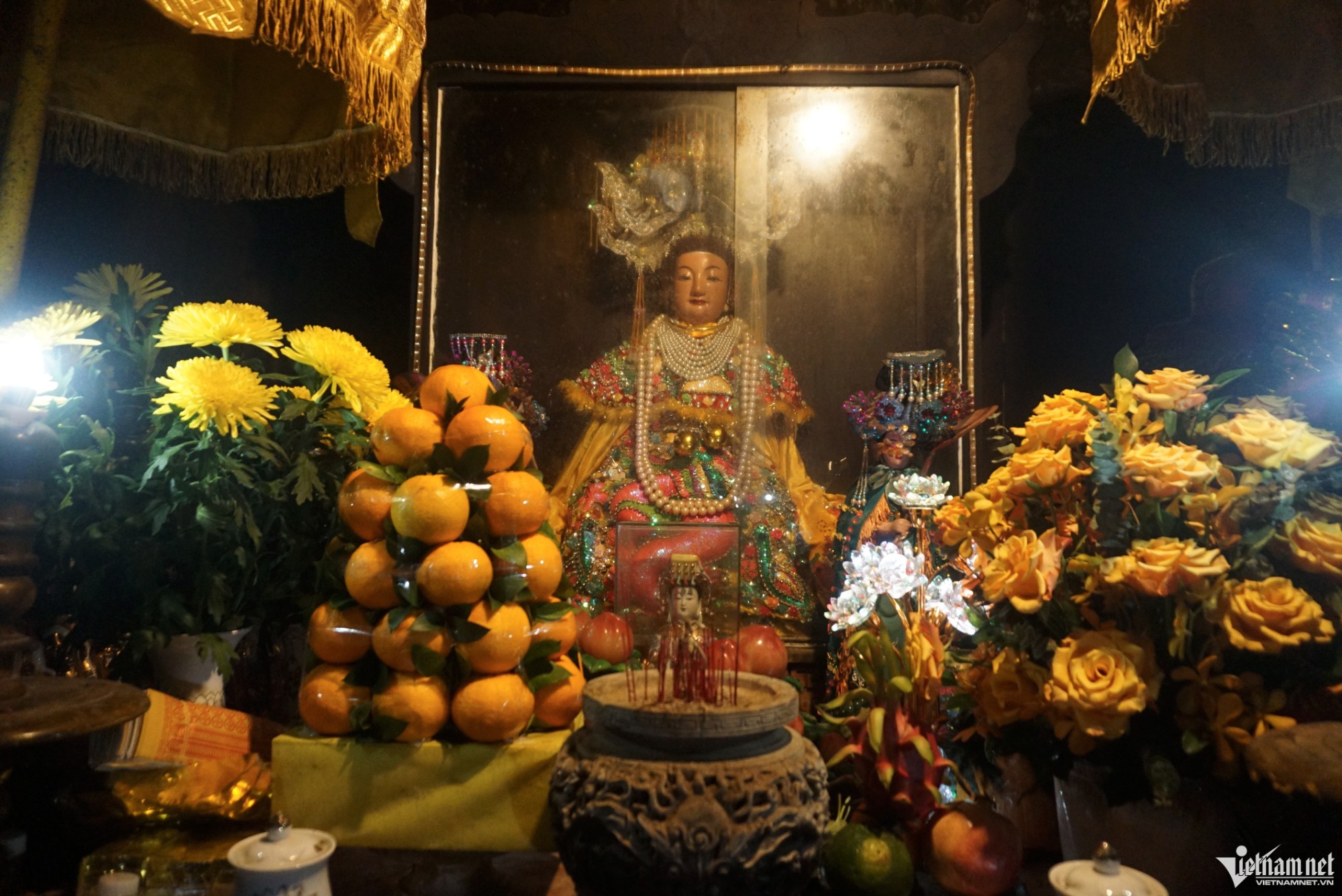 Trong hình là chùa cổ Trang Nghiêm Tự được xây dựng vào năm 1825 mang vẻ đẹp linh thiêng, cổ kính gồm ba gian. Trong đó, gian chính thờ Phật Quan Âm, bên trái thờ 3 vị Thánh (Quan Công, Quan Bình và Châu Xương) tượng trưng cho đức độ, trí dũng và lòng trung thành, gian phải thờ ông Tơ, bà Nguyệt, nơi các đôi trai gái đến cầu duyên.