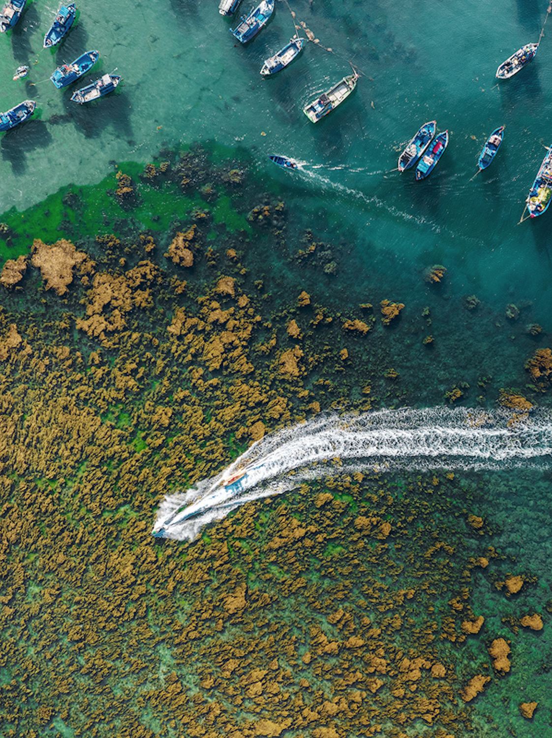 Một chiếc thuyền thúng như đang di chuyển trên những ngọn cây rong. Vào mùa, khung cảnh này trải dài trên mặt biển làng chài Nhơn Hải tới gành Trên ở thôn Hải Bắc, đến đảo Hòn Khô ở thôn Hải Đông và gành Dưới, ở thôn Hải Nam.