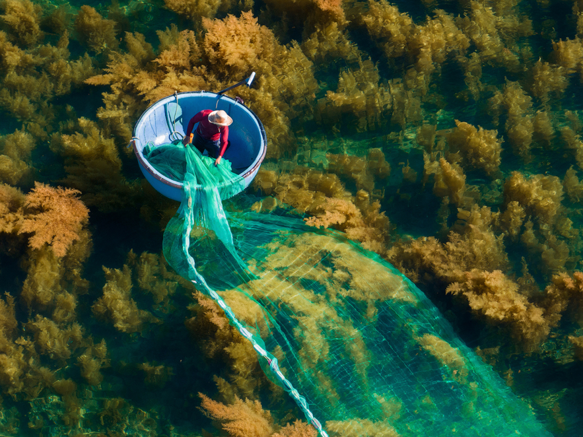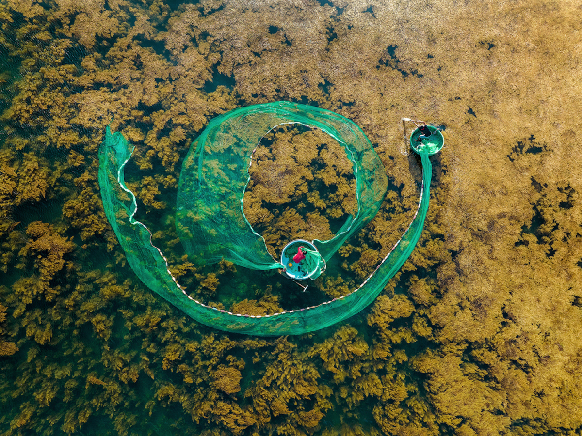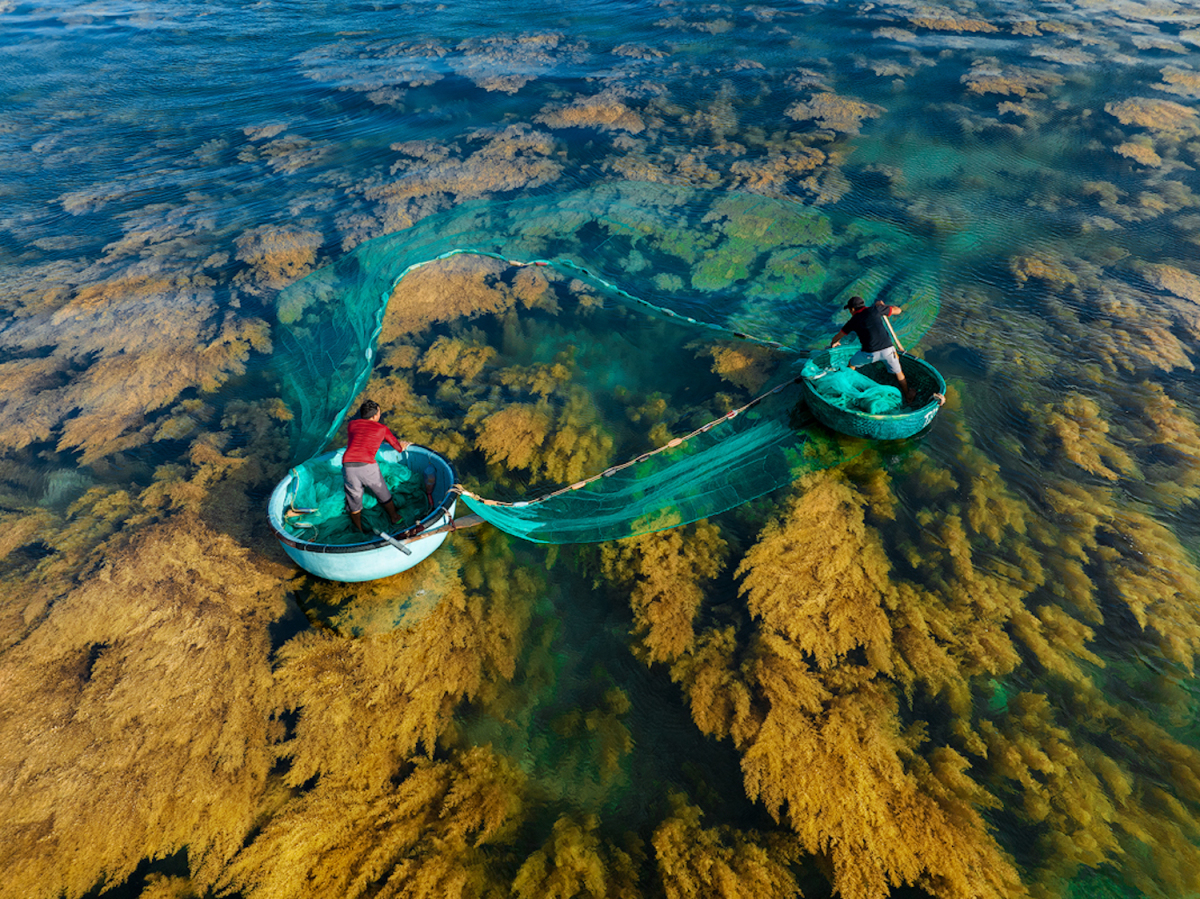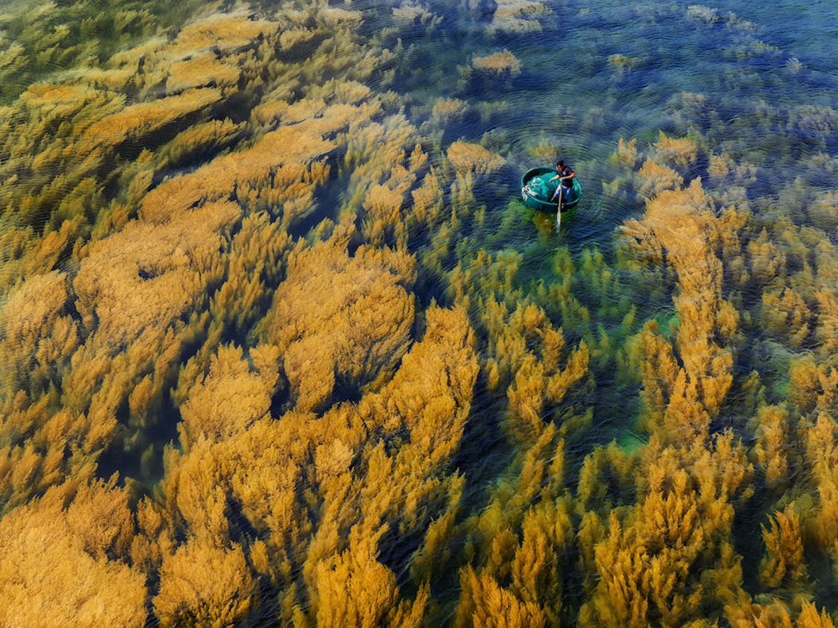 "Từ trên cao sắc vàng úa của rong biển hoà với sắc xanh của màu nước tựa như một khu rừng lá vàng dưới biển. Chúng càng mềm mại, sinh động khi kết hợp với sắc xanh của lưới vây ngư dân. Tôi tự hào khi được chia sẻ hình ảnh đẹp của quê hương", anh Cường nói.