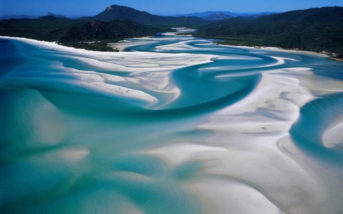 Du khách được khuyên nên mang theo một cặp kính mát trước khi tới bãi biển Whitehaven, bờ đông đảo Whitsunday, Australia. Cát ở đây có màu trắng lấp lánh như tuyết trên đỉnh núi Alps khi ánh nắng phản chiếu. Ngoài một khu cắm trại đơn sơ, toàn bộ bãi biển này không hề bị tác động bởi hoạt động của con người. Ảnh: Roughguides.