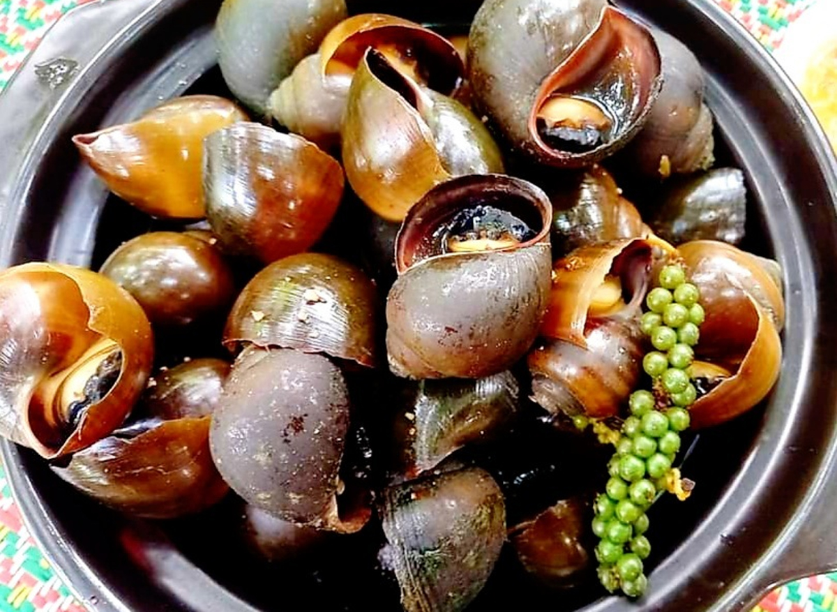 Ốc bươu hấp tiêu xanh: Ốc mua về ngâm cùng nước vo gạo cho nhả hết chất bẩn, rồi rửa sạch. Người miền Tây thường hấp ốc trong thố để giữ độ nóng lâu hơn. Sả cắt khúc xếp dưới đáy thố, cho ốc lên trên, thêm chút nước lọc, tiêu xanh. Hấp ốc khoảng 10 phút cho vừa chín tới để giữ độ giòn, ngọt đặc trưng. Món này chấm với muối ớt chanh, muối tiêu xanh hoặc muối tiêu chanh để cảm nhận đủ vị chua, cay, mặn và ngọt.