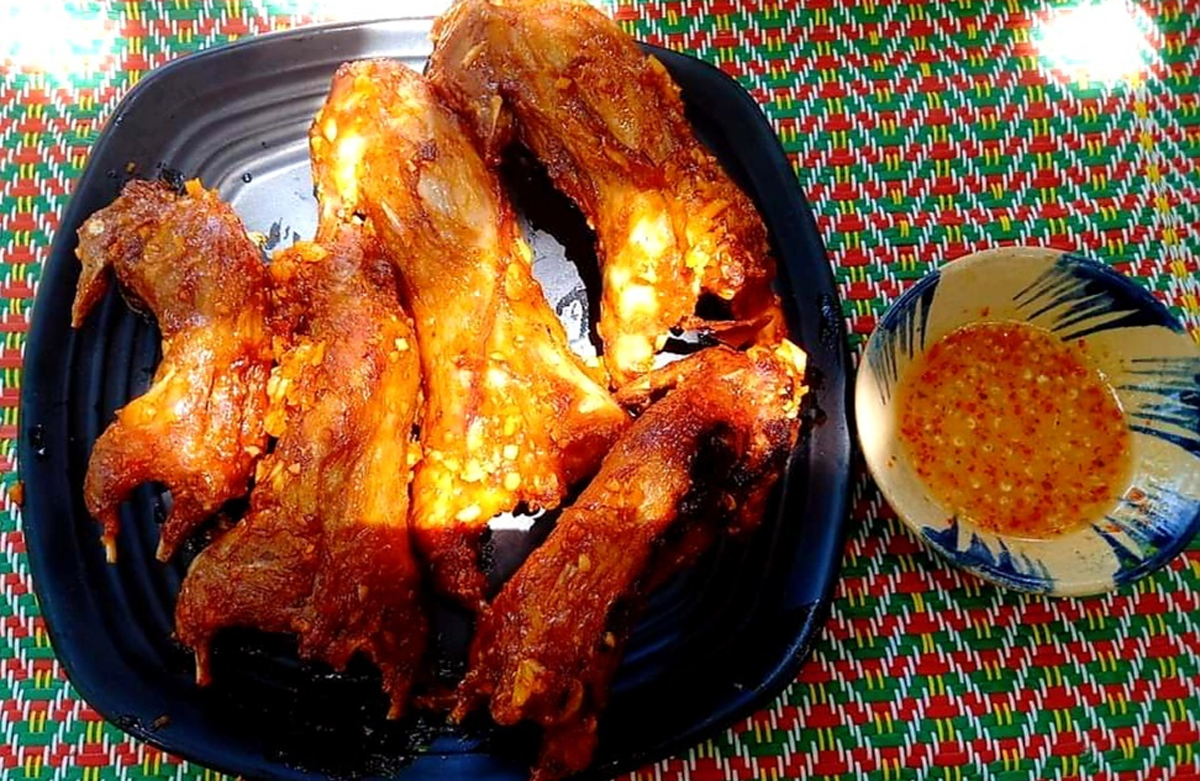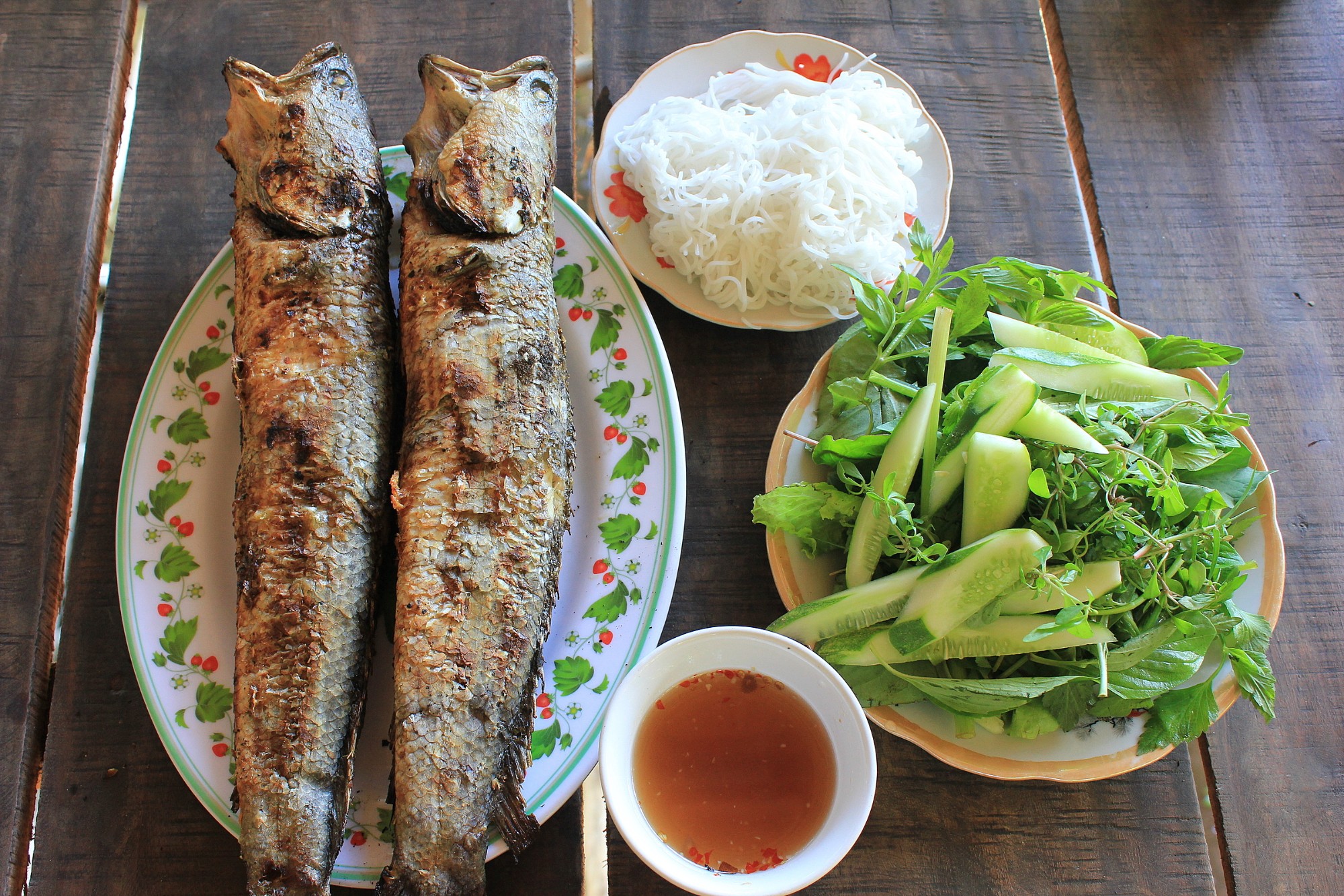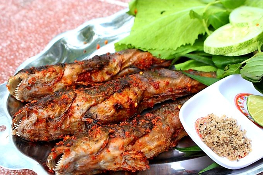 Cá thòi lòi nướng muối ớt: Loại cá này cho thịt nhiều, ngọt, dai, không xương dăm. Cá còn tươi, để nguyên con rửa sạch bùn, ướp chút muối ớt, sa tế, sau đó đặt trên bếp than nướng với lửa vừa. Khi da vừa vàng đều, dậy mùi thơm là cá chín. Món này sẽ chấm cùng muối tiêu hoặc nước mắm me kèm rau sống.