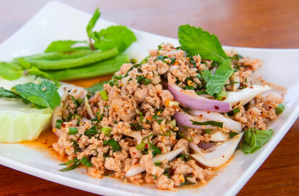 Ảnh: The Broke BackpackerLaab Jay hay salad thịt cay có nguồn gốc từ miền Bắc Thái Lan. Sự kết hợp của thịt băm, lá bạc hà, rau mùi, nấm và nước xốt tạo nên hương vị độc đáo cho món ăn. Thành phần quan trọng nhất trong món Laab Jay là khao khua (thính gạo Thái Lan), giúp tạo độ giòn cho món salad.