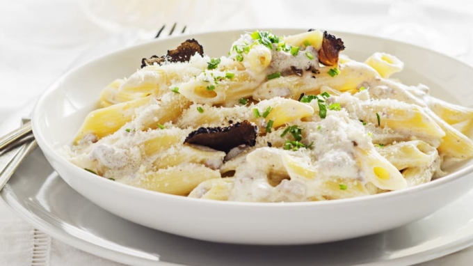 Penne alla norcina là đặc sản của vùng Umbria, với mì ống được cuộn trong kem, trộn lẫn xúc xích Norcia cổ điển (đã được nấu với hành tây và rượu trắng trước khi cắt nhỏ trộn với mỳ), và phô mai pecorino. Món ăn được miêu tả là "tinh tế" và "ngon miệng". Ảnh: Adobe Stock