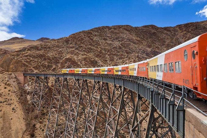 “Chuyến tàu đi đến những đám mây” chạy theo hình zích zắc băng qua dãy núi Andes trên tuyến đường từ Salta, Argentina tới biên giới với Chile. Đây còn là một trong những tuyến đường sắt cao nhất thế giới. Ảnh: Marco Guoli.