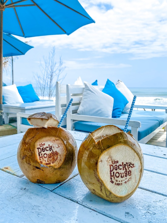 12h-16: Buổi trưa, nhóm di chuyển ra biển An Bàng cách đó hơn 4 km để nghỉ ngơi, ăn trưa. Sau đó, mọi người ghé quán Deck House (ảnh) để uống nước, giá từ 70.000 đồng một ly. Linh chọn nơi này vì quán trang trí đẹp.