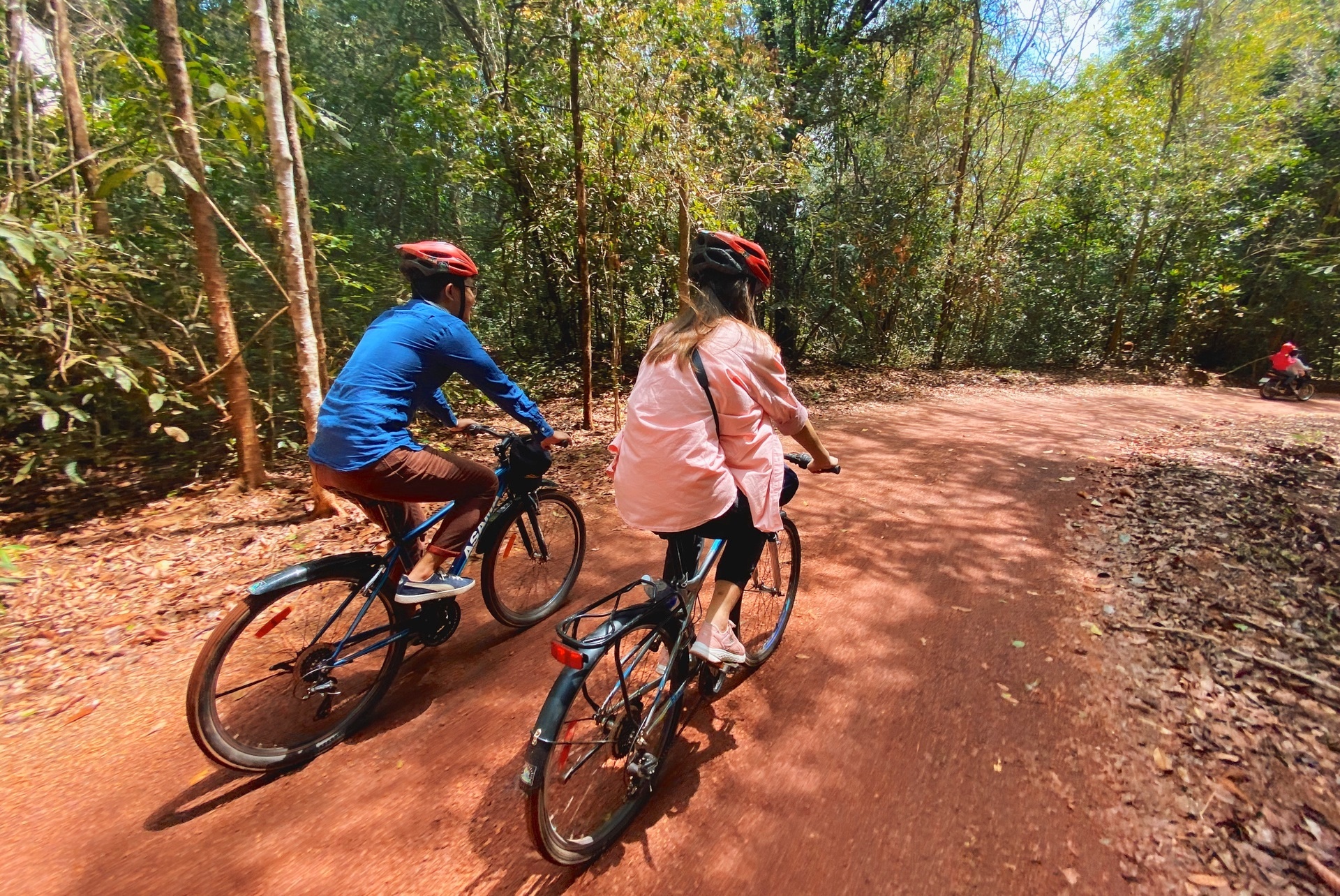 Du khách có nhiều lựa chọn tour xe đạp, trekking với độ khó, cung đường và trải nghiệm đa dạng. Hai bên đường là rừng cây xanh mát, nên dù trời nắng gắt, không khí vẫn trong lành, mát mẻ.
