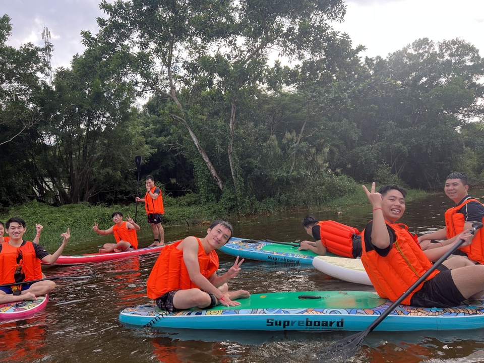 Địa điểm có nhiều hoạt động giải trí, phù hợp với nhiều lứa tuổi. Ảnh: Làng du lịch sinh thái Tre Việt/Facebook.Bạn có thể tham gia các hoạt động vui chơi như đạp xe trên nước, chèo thuyền thúng. Tại đây cũng có nhà hàng buffet trưa với giá khoảng 180.000 đồng/người.
