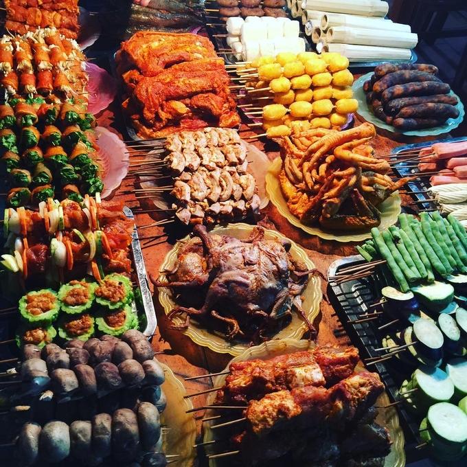Ít có nơi nào là thực đơn các món nướng lại phong phú như ở Sa Pa. Không chỉ có thịt bò, thịt lợn hay xúc xích, người ta còn xiên cả cá, lòng, dạ dày, khoai lang, rau củ quả để nướng. Tùy từng loại mỗi xiên có giá tiền khác nhau, trung bình khoảng 10.000 đồng. Cái thú vị nhất của món này là thực khách chọn xiên rồi chờ chủ quán nướng chín, đến khi thưởng thức nóng hôi hổi, thơm phức. Ảnh: 2late134.