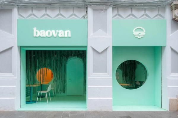 Thiết kế với màu xanh dịu mắt cũng như những đường tròn lấy cảm hứng từ chiếc bánh bao của nhà hàng Baovan mang lại thiện cảm cho khách hàng. Ảnh: ICON. Nhà hàng Baovan là một thương hiệu hướng đến biển cả, được thể hiện qua khẩu hiệu "Bia, biển và bánh bao".