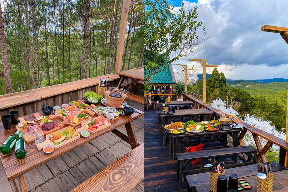 - Tầng một có khu vực nướng trong nhà cùng các phòng riêng, thuận tiện cho mọi người vừa ăn đồ nướng vừa ngắm thung lũng rừng thông. Tầng hai là không gian nướng ngoài trời với view ngắm mây.