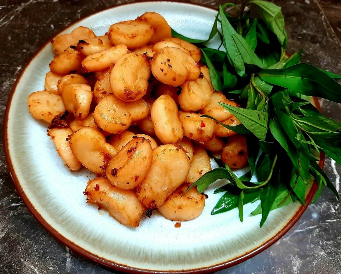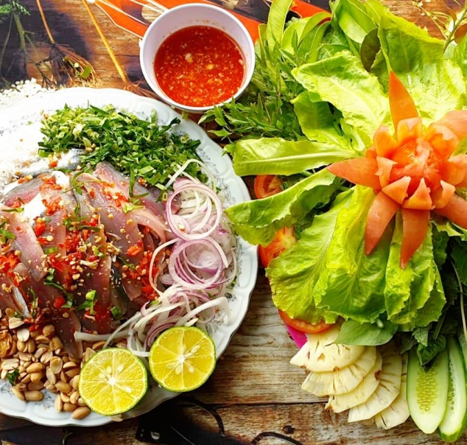Cá trích tươi trộn cùng hành tây, dừa nạo, tỏi phi vàng... cuộn cùng rau thơm chấm với nước mắm chua cay. Ảnh: Hà Lâm Gỏi cá trích là món ăn dân dã nhưng lại cầu kỳ trong cách chế biến. Cá làm gỏi phải thật tươi để giữ thịt ngọt, không tanh. Cá được làm kỹ và lóc bỏ xương, lấy phần thịt hai bên. Sau đó, trộn cá cùng nước sốt chua có kèm hành tây, dừa nạo, lạc (đậu phộng), các loại rau gia vị... Tùy quán, đầu bếp sẽ làm nước trộn gỏi bằng cốt chanh hoặc giấm.