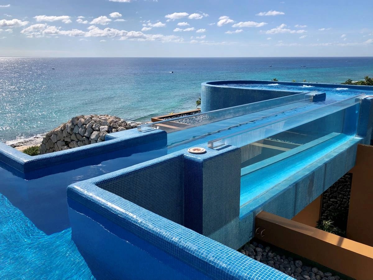 4. Bể bơi khách sạn Xcaret, Playa del Carmen, Mexico: Bể bơi trên sân thượng của khách sạn này được thiết kế để làm phông nền hoàn hảo cho một bức ảnh. Cây cầu kính cho bạn cảm giác như đang bơi trong không khí. Ảnh: Gringajourneys.