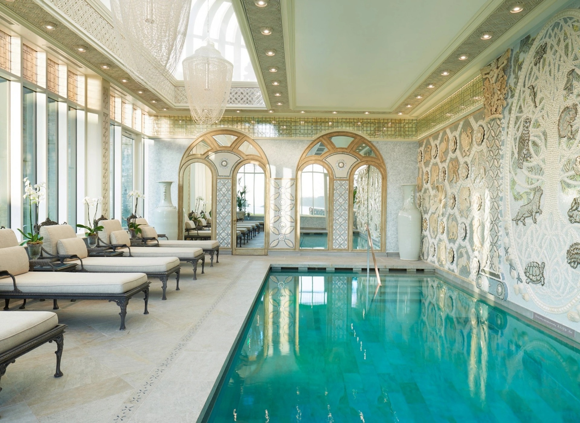 5. Bể bơi Lâu đài Ashford, Mayo, Ireland: Với 39.000 hashtag, bể bơi của lâu đài cổ kính vùng Mayo đứng thứ 5 trong danh sách. Kiến trúc sư người Pháp, Phillipe Bonino, thiết kế bể trong đài quan sát lộng lẫy. Bạn có thể vừa thả mình trong làn nước, vừa ngắm các đèn chùm bằng ốc biển và bức tranh ghép của nghệ sĩ Jane Du Rand. Ảnh: DPP Travel.