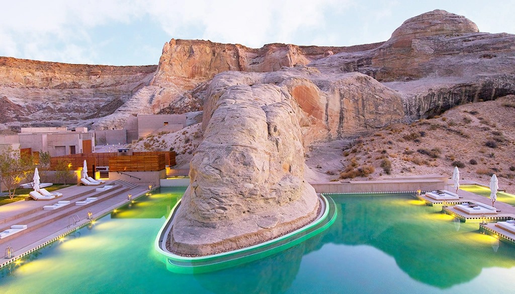 6. Bể bơi Khu nghỉ dưỡng Amangiri, Utah, Mỹ: Khu nghỉ dưỡng Amangiri nằm ở vùng sa mạc của Utah, với bể bơi nằm trong sân và bao quanh là đá. Đây là nơi lý tưởng để bạn giải nhiệt. Nơi này không mang cảm giác là bể bơi của khách sạn, mà giống như hồ nước tự nhiên, đem lại trải nghiệm mới lạ. Ảnh: Hotelyouwant.