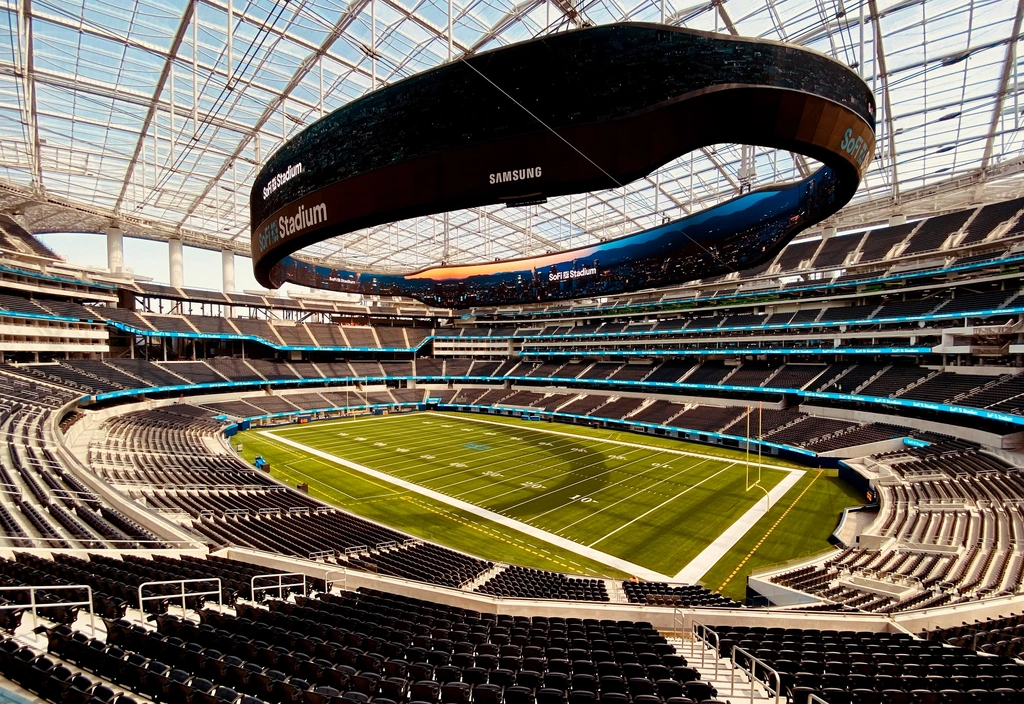 4. Sân vận động SoFi, Inglewood, Mỹ (5,5 tỷ USD): Nằm ở Inglewood, California, sân vận động kiêm khu phức hợp giải trí này có sức chứa 70.000 người, với mái che có thể thu gọn và cửa trượt để không khí lưu thông. Nơi đây còn có khu biểu diễn nghệ thuật 6.000 chỗ dành cho các buổi hòa nhạc hoặc sự kiện khác. Ảnh: NBC.
