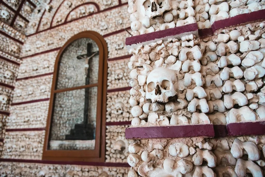 Capela Dos Ossos (Evora, Bồ Đào Nha): Capela Dos Ossos có nghĩa là "Nhà nguyện xương", nằm ở thành phố Evora của Bồ Đào Nha. Tường của nhà nguyện dưới lòng đất này được bao phủ bằng hài cốt. Không gian này được xây dựng từ thế kỷ 16, bởi một tu sĩ muốn khách tham quan chiêm nghiệm về sự ngắn ngủi của đời người. Ảnh: Loveofwanderlust.