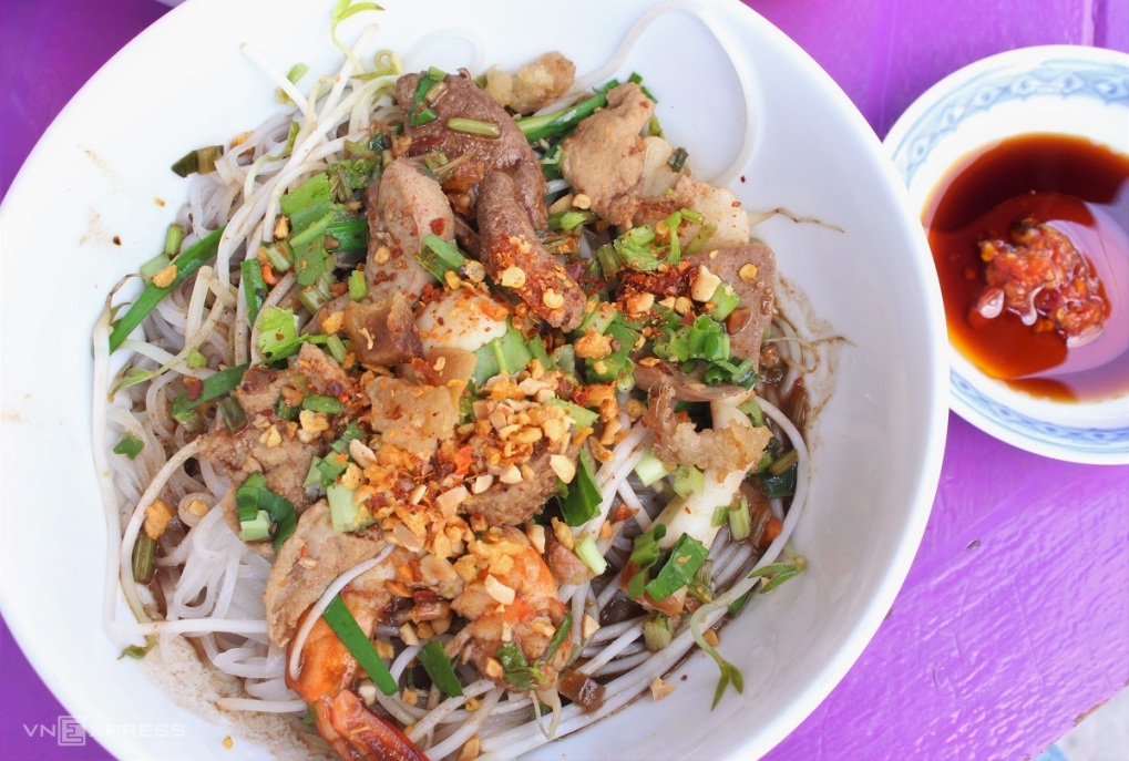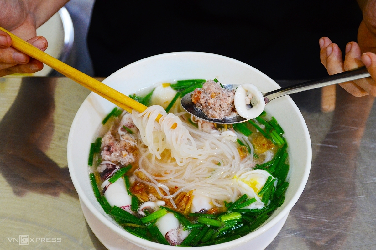 Ảnh: Nguyễn ThyHủ tiếu Nam Vang có xuất xứ từ Campuchia nay đã được biến đổi để phù hợp khẩu vị người Việt. Thành phần chính của món ăn là sợi hủ tiếu được trụng mềm còn giữ độ dai, topping có tôm, thịt nạc, tim, gan heo, trứng cút khá đa dạng, được chan ngập trong nước dùng đậm đà thơm ngọt từ xương, ăn kèm các loại rau sống tươi ngon như tần ô, giá... Trung bình mỗi tô hủ tiếu có giá 55.000 đồng, phần ăn đặc biệt có thể lên tới 130.000 đồng một tô.