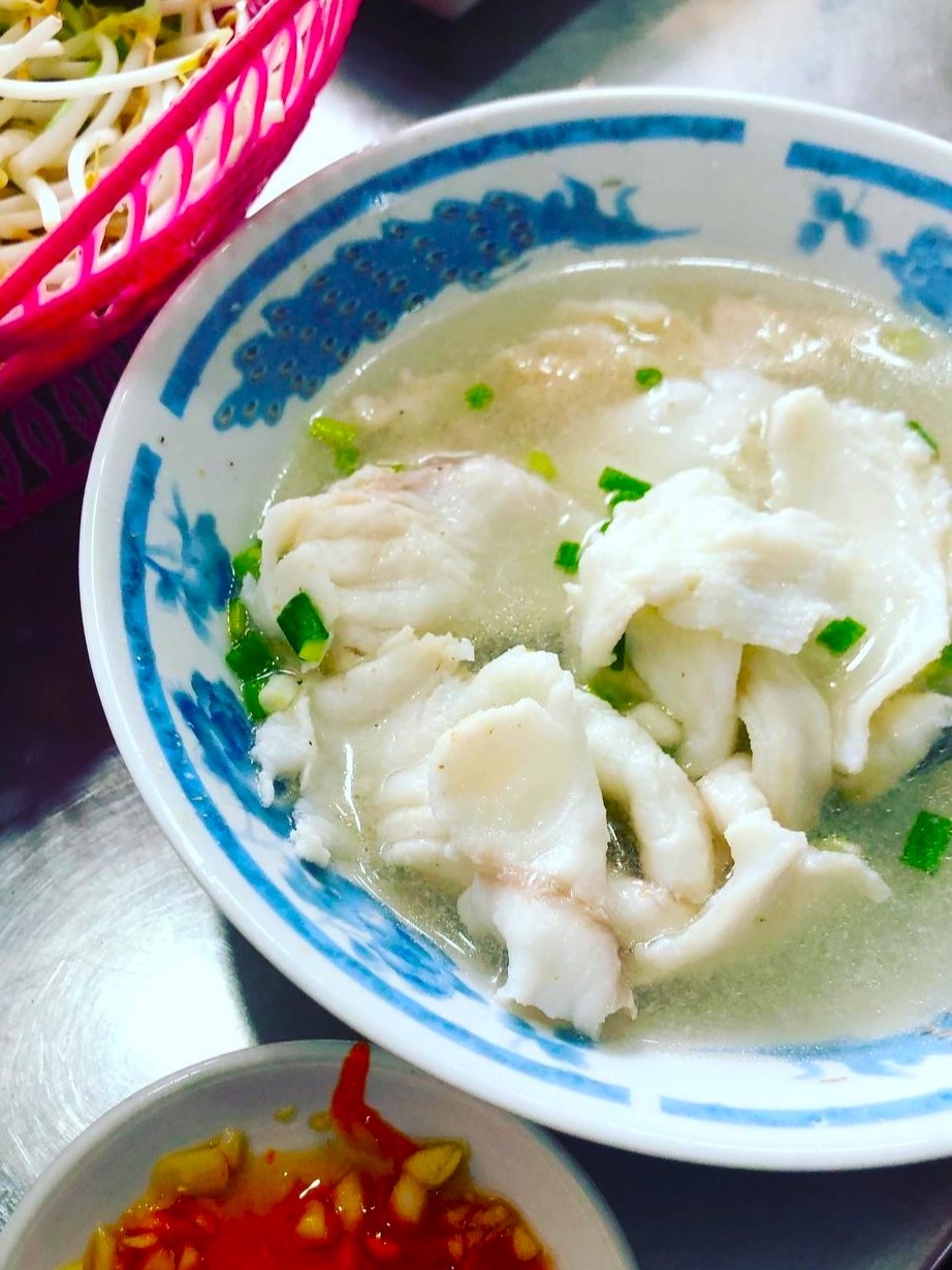 Ảnh: Instagram ayonoihTương tự hủ tiếu hồ, hủ tiếu cá cũng là món quen thuộc với người Hoa ở Sài Gòn, món ăn có sợi mềm, mỏng, lớn gấp đôi bánh phở. Topping ăn kèm duy nhất là thịt cá lóc phi lê được tẩm ướp gia vị, chần chín và thêm chút hành lá dậy mùi thơm. Nước dùng có màu hơi đục, nấu từ cá và xương ống heo có độ ngọt thanh, đậm đà. Tuy nhiên, giá hủ tiếu cá được nhận xét khá cao so với mặt bằng chung, một phần ăn có thể hơn 100.000 đồng/tô.