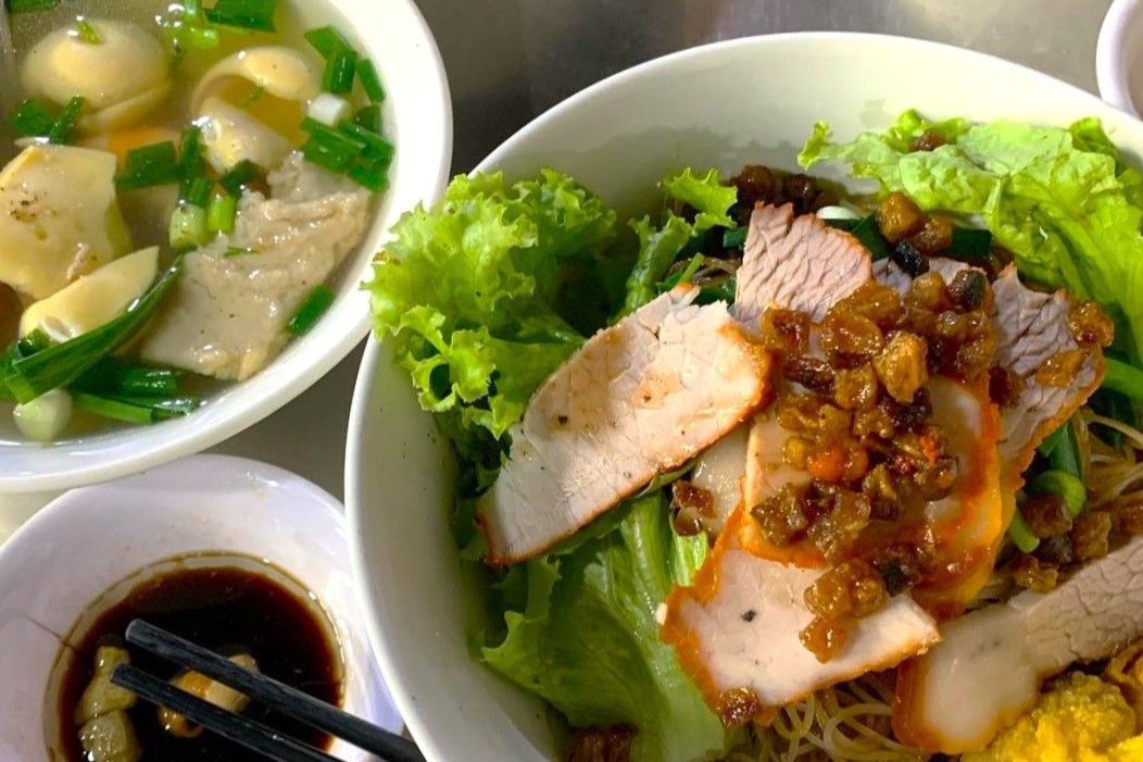 Ảnh: Instagram quicksandHủ tiếu trứng cuộn khá thu hút giới trẻ Sài Gòn bởi cách chế biến độc lạ. Điểm đặc biệt nhất của món ăn là trứng cuộn (trứng đánh đều, nêm gia vị rồi cho vào ruột heo), luộc chín trong nồi nước lèo sau đó cắt lát mỏng. Trứng cuộn ăn mềm, có độ giòn sật dễ ghiền. Thông thường khách hay gọi hủ tiếu khô trộn với sốt đậm gia vị, có thịt xá xíu và hoành thánh chiên giòn, kèm chén nước súp có trứng cuộn riêng.