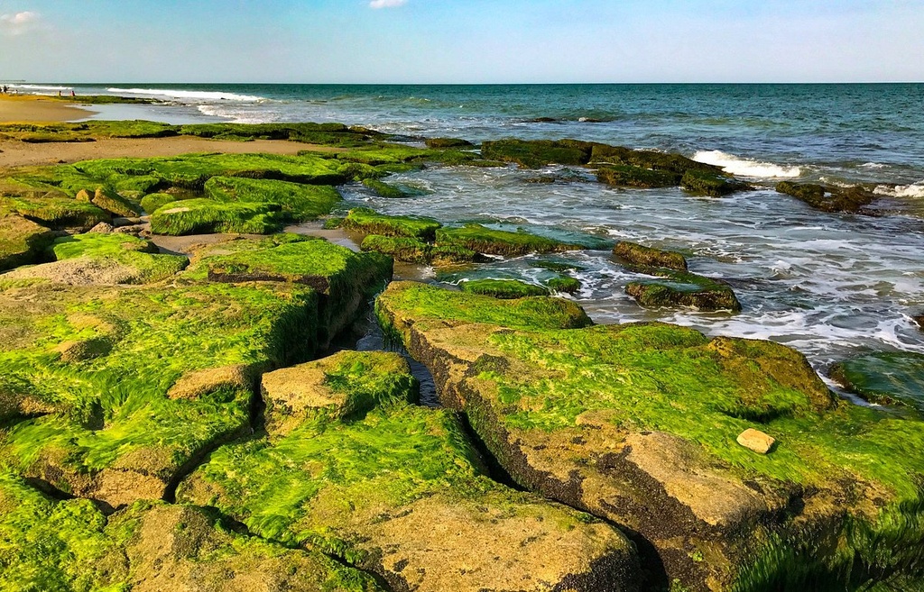 Bãi biển Quảng Ngãi, Việt Nam: Dưới tiết trời nắng ấm, các cấu kiện phá sóng ở bãi biển Quảng Ngãi nhuộm màu rêu xanh biếc, tạo nên bức tranh ven biển độc đáo. Bãi biển sở hữu nét đẹp hoang sơ, cùng biển xanh, cát trắng, nắng vàng. Đây còn là thiên đường ẩm thực với các món ngon, đặc trưng vùng biển như tôm, cua, ghẹ, mực… Ảnh: Minh Hoàng.