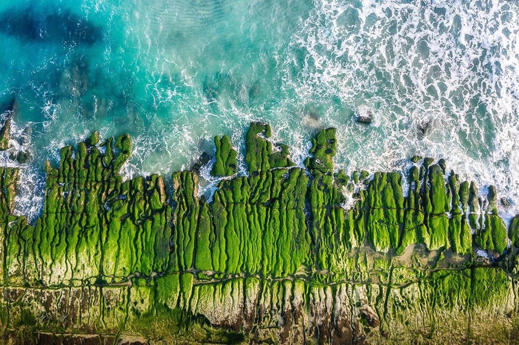 Bãi biển Lão Mai, Đài Loan, Trung Quốc: Vào mùa xuân từ tháng 2 đến tháng 5, khung cảnh kiều diễm của bãi biển Lão Mai thu hút du khách bởi lớp rêu xanh mướt phủ trên các phiến đá. Đây là điểm đến lý tưởng để đi bộ ngắm cảnh, tận hưởng không gian thanh bình, trốn khỏi thành phố tấp nập. Ảnh: Tripbaa.