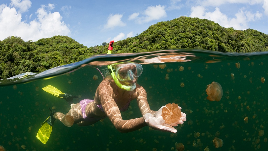 The Jellyfish Lake (Palau): Jellyfish Lake (hồ sứa) là một hồ nước biển nằm trên đảo Eil Malk ở Palau. Hồ nước độc đáo có hàng triệu con sứa vàng di chuyển trong lòng hồ mỗi ngày. Loài sứa này có màu vàng đậm, con người chạm vào có thể bị đốt gây cảm giác khá châm chích. Tuy nhiên vết đốt của chúng không gây hại. Ảnh: Nine Entertainment Company.