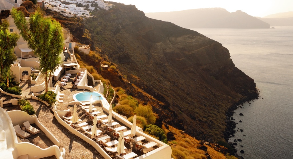 Mystique Hotel, Santorini, Hy Lạp: Xây dựng trên sườn vách đá và nhìn ra biển Aegean, Mystique Hotel là điểm đến hoàn hảo cho các cặp đôi tận hưởng tuần trăng mật lãng mạn và sang trọng. Mỗi căn biệt thựcó hồ bơi riêng với tầm nhìn tuyệt đẹp ra quang cảnh thiên nhiên bình dị. Nơi đây cũng có các tiện ích như khu vực ăn uống trong nhà và ngoài trời, phòng tập thể dục… Ảnh: Kenwood Travel.