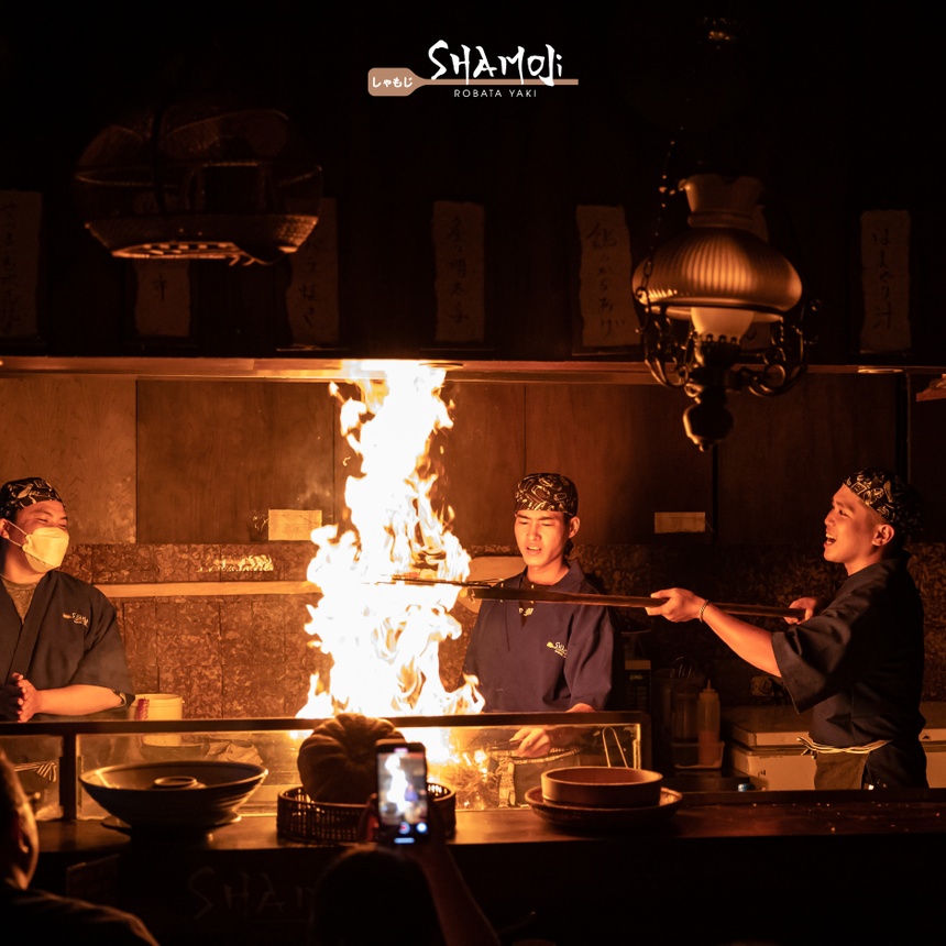 Ảnh: Shamoji Robata Yaki. Nhà hàng này được được thiết kế theo lối kiến trúc đặc trưng của những ngôi nhà Nhật Bản truyền thống thời Edo. Trong tiếng Nhật, Robata có nghĩa là “nướng đồ ăn trên than nóng”, thế nên thực đơn tại đây nổi bật với các món nướng mang đậm văn hoá Nhật.