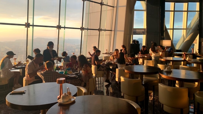 123F Lounge nằm ở tầng trên cùng, cách mặt đất 555 m. Nhiều vị khách vẫn nghĩ lối lên nhà hàng đơn giản, chỉ cần bước vào thang máy, bấm nút và đợi vài phút. Nhưng thực tế, toàn bộ trải nghiệm từ mặt đất lên đến nhà hàng mất gần một tiếng.