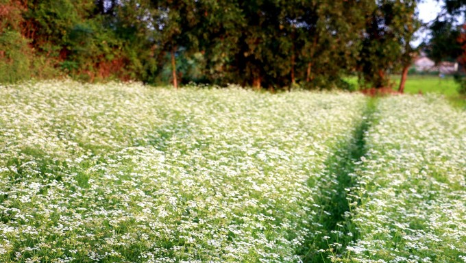 Cánh đồng ngò rí xanh ngút, trổ bông trắng, tỏa hương thơm ngào ngạt thu hút du khách. Ảnh: Khánh Thiện Cánh đồng ngò rí nằm ở ấp Phước Tân 1, xã Tân Hưng, cách trung tâm TP HCM khoảng 100 km. Hoa nở nhiều vào những dịp cuối năm, kéo dài đến sau Tết. Những khóm hoa trắng cánh mỏng manh tạo nên khung cảnh thơ mộng, đặc biệt thích hợp với những du khách muốn chụp hình.