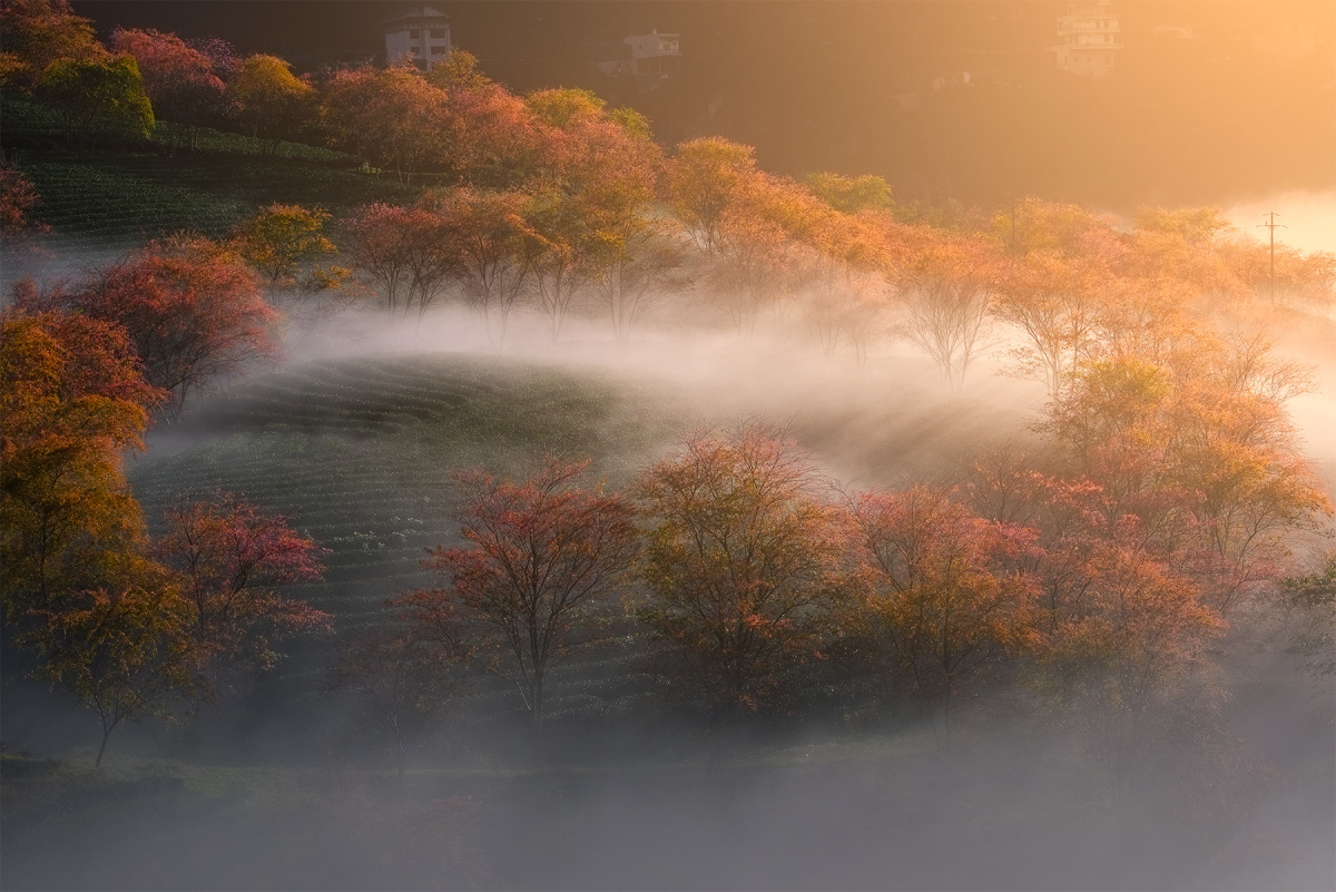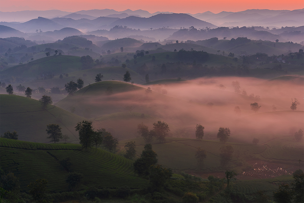 Đồi chè Mộc Châu còn là niềm cảm hứng bất tận cho các tay máy và dân du lịch. "May mắn khi đến nơi gặp thời tiết đẹp lúc bình minh, bên dưới đồi chè là những làn sương như lụa. Tôi cùng nhiều bạn bè nhiếp ảnh ba miền bị choáng ngợp trong khoảnh khắc ấy", Trần Linh chia sẻ.