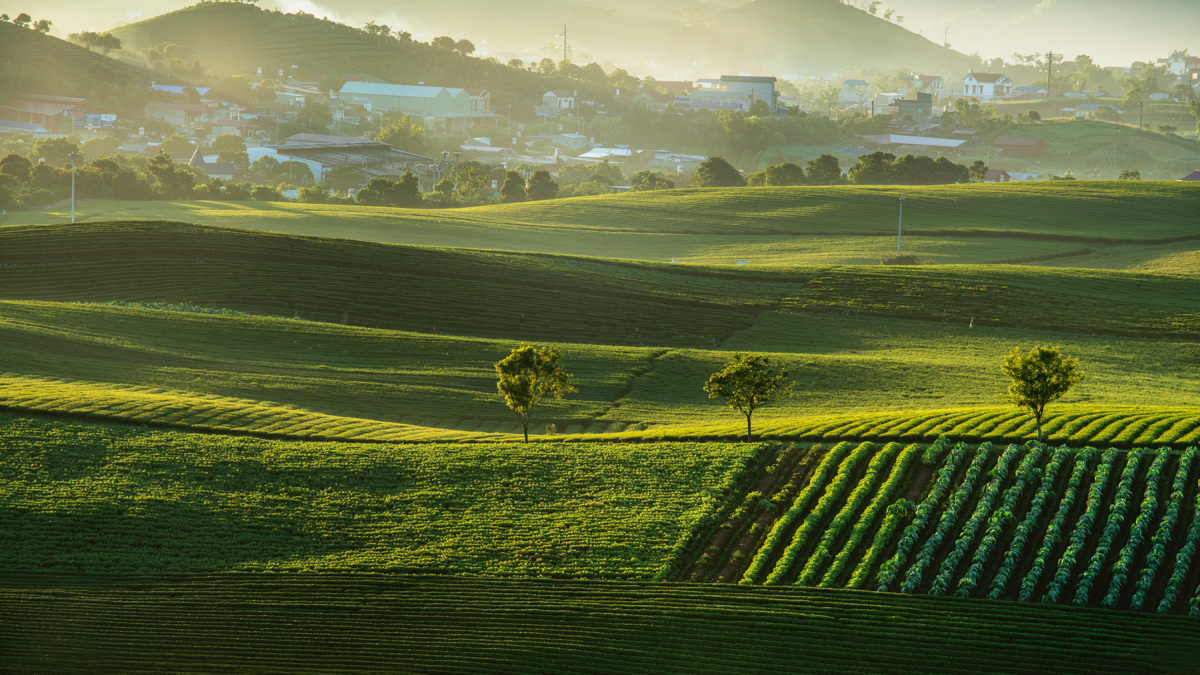 Sương sớm trên đồi chè Long Cốc lúc bình minh. Những ốc đảo chè này khiến Long Cốc được gọi là "vịnh Hạ Long vùng trung du", là một trong những đồi chè đẹp nhất Việt Nam.