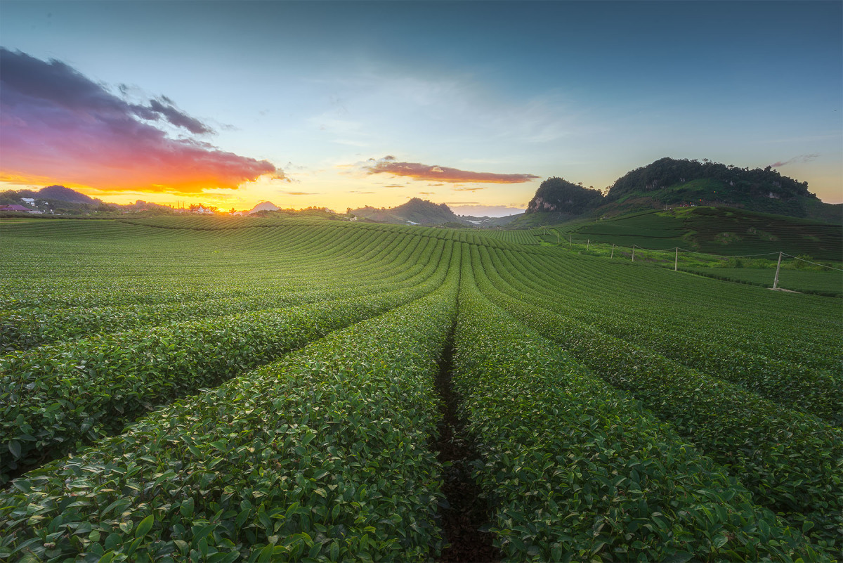 Những luống chè trải dài bên triền đồi lúc hoàng hôn. Ở Mộc Châu, các loại chè được trồng chủ yếu gồm shan tuyết, oolong, chè giống Nhật... Nhiều năm gần đây, Mộc Châu phát triển các khu vực đồi chè kết hợp quảng bá du lịch nên có thêm các đồi chè trái tim để thu hút du khách đến chụp ảnh.