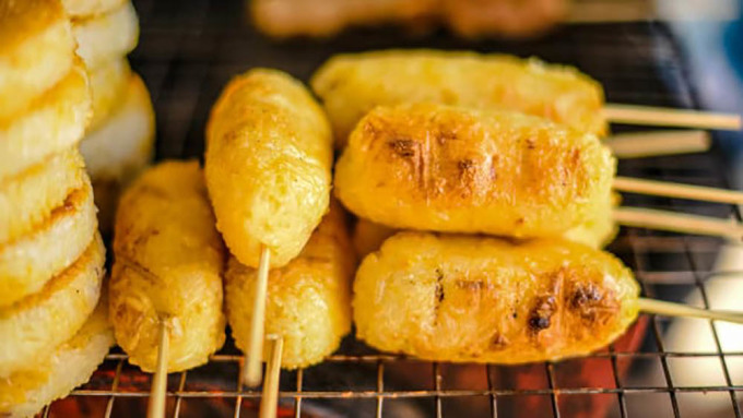 "Trông có vẻ đơn giản - một nắm xôi nướng xiên que - nhưng có nhiều thứ ở món ăn đường phố này hơn là vẻ nhìn bắt mắt" là nhận xét về khao jee (ảnh), đặc sản đến từ Lào. Món bánh nếp nướng này còn có một phiên bản khác là khao jee pâté, tương tự bánh mì kẹp của việt Nam, với nhân là pate gan heo, cà rốt ngâm chua, dưa chuột, đu đủ và tương ớt. Ngoài ra, du khách có thể thử thêm món nam khao hay salad cơm giòn. Ảnh: Adobe Stock