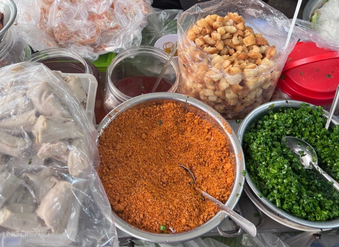 Topping cơ bản của món bánh bèo gồm: mỡ hành, tôm khô, chả cây, bánh mì chiên và đồ chua. Tôm khô được chế biến từ tôm tươi xay nhuyễn, đậm mùi tôm đặc trưng. Chả cây Nha Trang đầy đặn, vị không quá ngọt, rất vừa miệng. Đồ chua làm từ cà rốt và đu đủ bào sợi nhỏ, ngâm giòn. Ngoài ra, thực khách có thể gọi thêm thịt nướng ăn kèm bánh bèo.