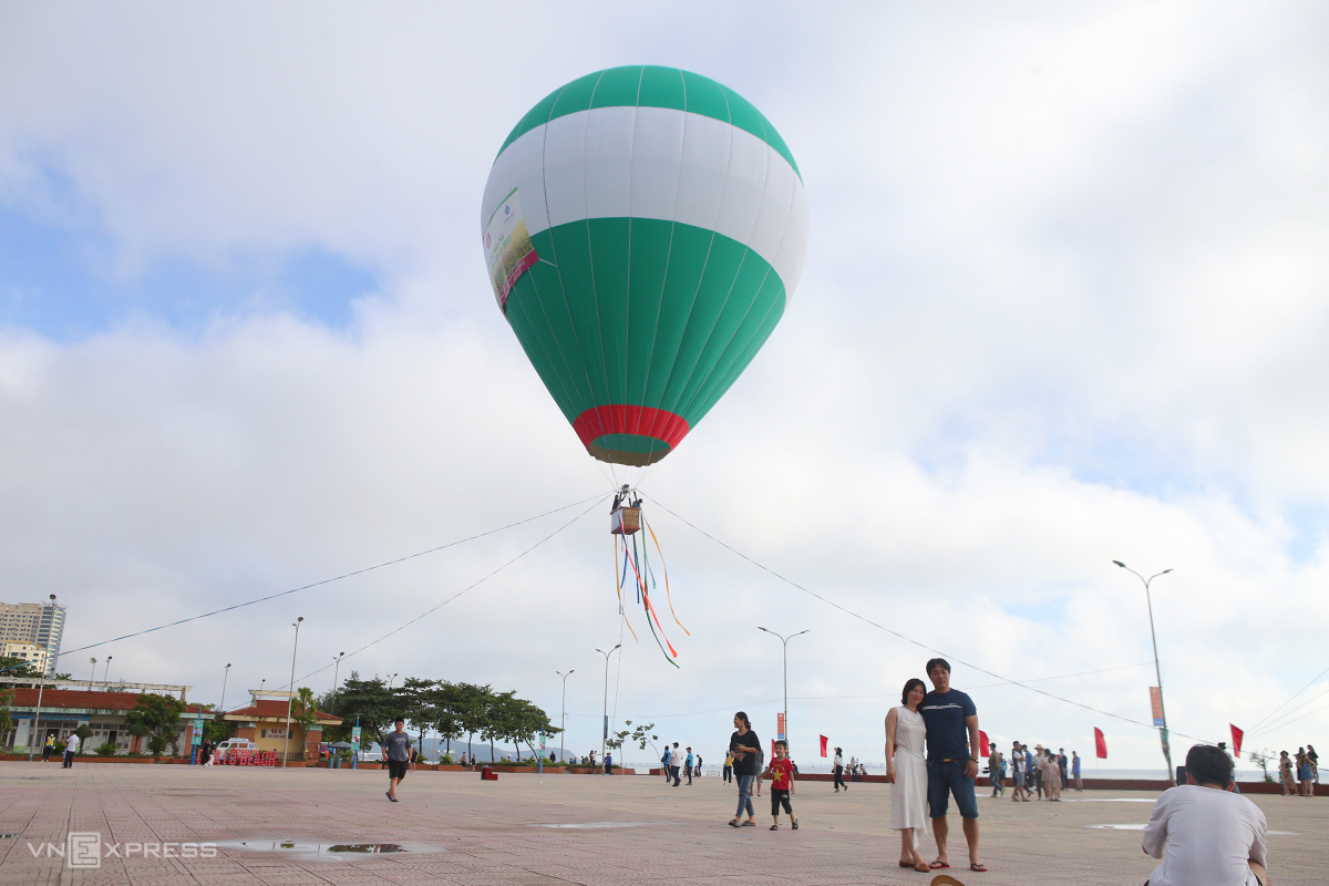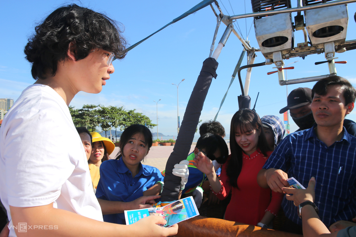 Phía dưới hàng trăm du khách chờ đến lượt trải nghiệm. "Lần đầu tôi đến Cửa Lò và trúng ngày hội nên tranh thủ trải nghiệm. Cảm giác tuyệt vời khi được đứng trong khinh khí cầu để cảm nhận khung cảnh phía dưới", anh Ngọc Tú, trú Hà Tĩnh, nói.