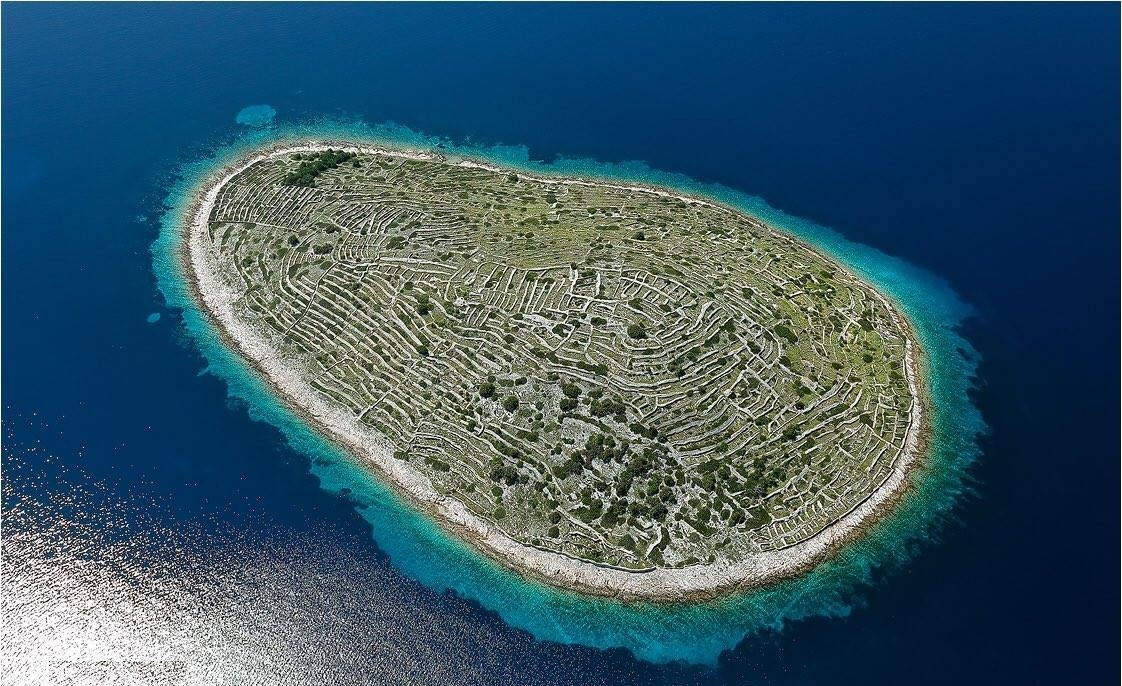 Hòn đảo "dấu vân tay" Baljenac Hòn đảo Baljenac hình bầu dục được bao phủ bởi một hệ thống tường đá nối dài 23 km. Ban đầu chắc hẳn bạn sẽ nghĩ đó là một mê cung được xây dựng vào thời cổ đại, nhưng thực tế các bức tường cao đến thắt lưng này được những người nông dân thiết kế để giúp cho hoạt động canh tác trong nông nghiệp trở nên dễ dàng hơn.