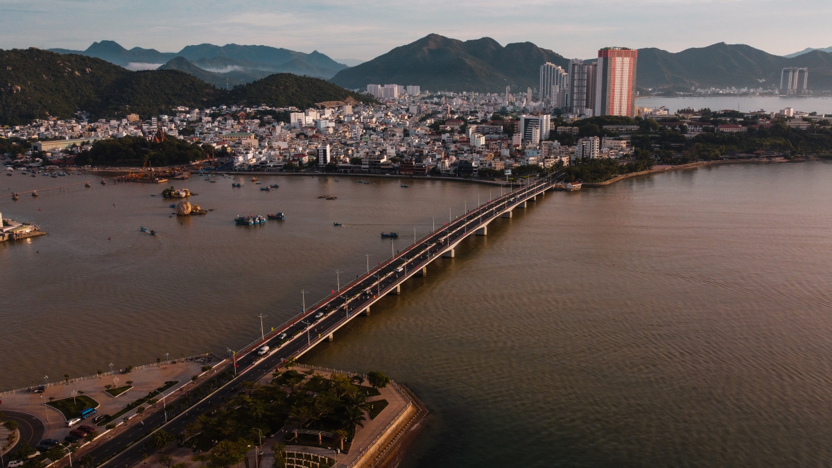 Cầu Trần Phú nhìn từ trên cao vào sáng sớm. Đây là công trình tạo nên điểm nhấn trên tuyến đường biển nối dài với đường Trần Phú và Phạm Văn Đồng, là một trong những cây cầu huyết mạch của thành phố giúp cho giao thông hai bên bờ sông cái được thuận tiện và dễ dàng hơn cho người dân.