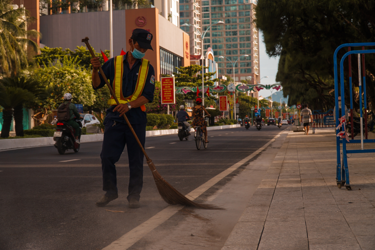 Công việc quen thuộc buổi sáng của nhân viên môi trường đô thị dọc đường biển Trần Phú.