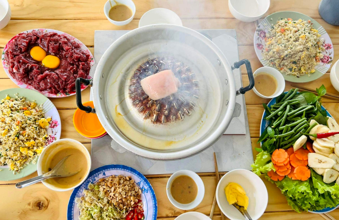 Thịt bò được nướng trên vỉ có thiết kế nhô cao như hình quả núi. Ảnh: Mỹ Nhung Món ăn trở thành đặc sản, thu hút du khách bởi cách chế biến độc đáo. Thịt bò được xếp lần lượt trên chiếc vỉ nướng bằng gang, ở giữa thiết kế nhô lên như một quả núi. Trước khi ăn, người ta đặt một miếng mỡ lợn dày trên đỉnh vỉ. Sức nóng của bếp than hồng làm miếng mỡ lợn chảy đều, thấm vào thịt bò.