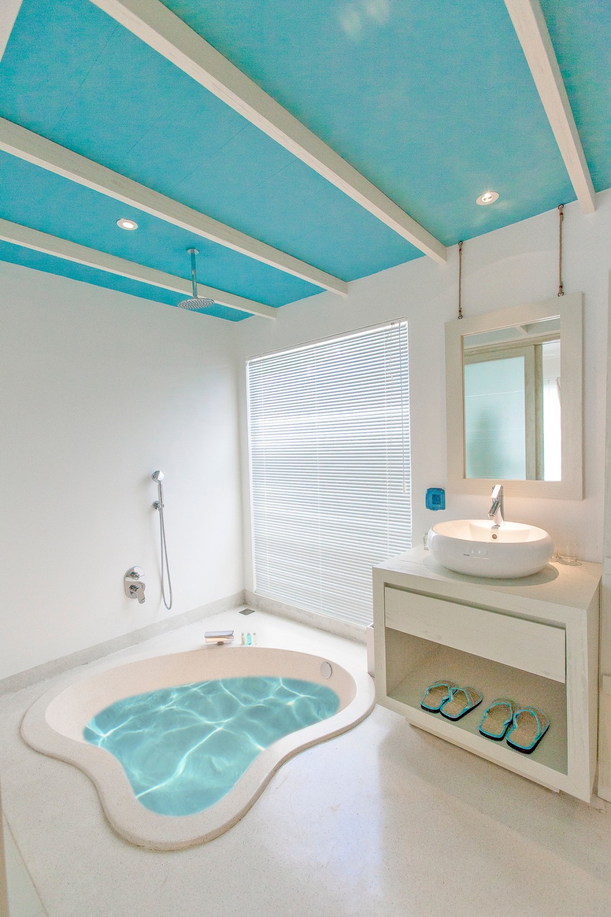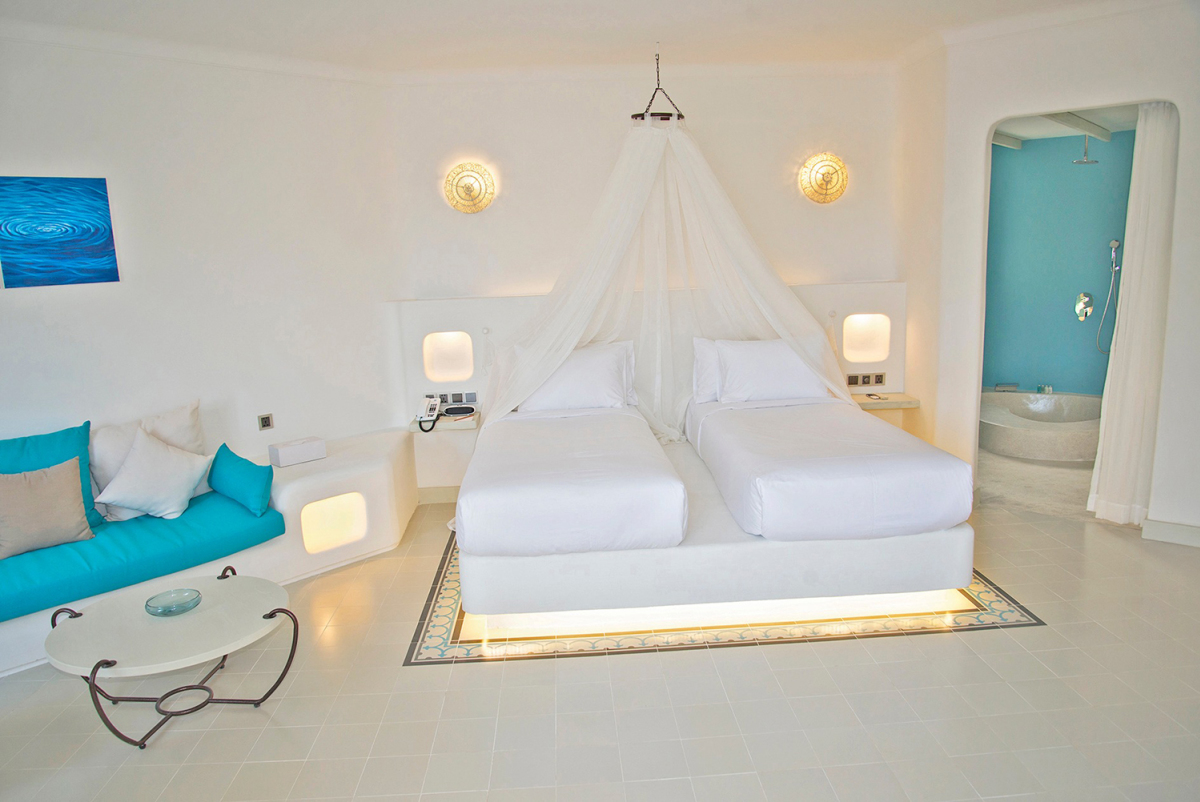Ngoài những không gian bên ngoài như bãi biển riêng, không gian nhiều cây cối giúp du khách tìm về thiên nhiên, hít thở không khí trong lành thì những căn phòng cũng là điểm nhấn của khu nghỉ dưỡng này. Resort có hai màu xanh và trắng chủ đạo cả ở bên ngoài lẫn trong phòng, mát mẻ và gợi nhắc đến màu sắc của hòn đảo Santorini. Nội thất đơn giản, khá lạ mắt nếu so với các khu nghỉ dưỡng khác ở Việt Nam.