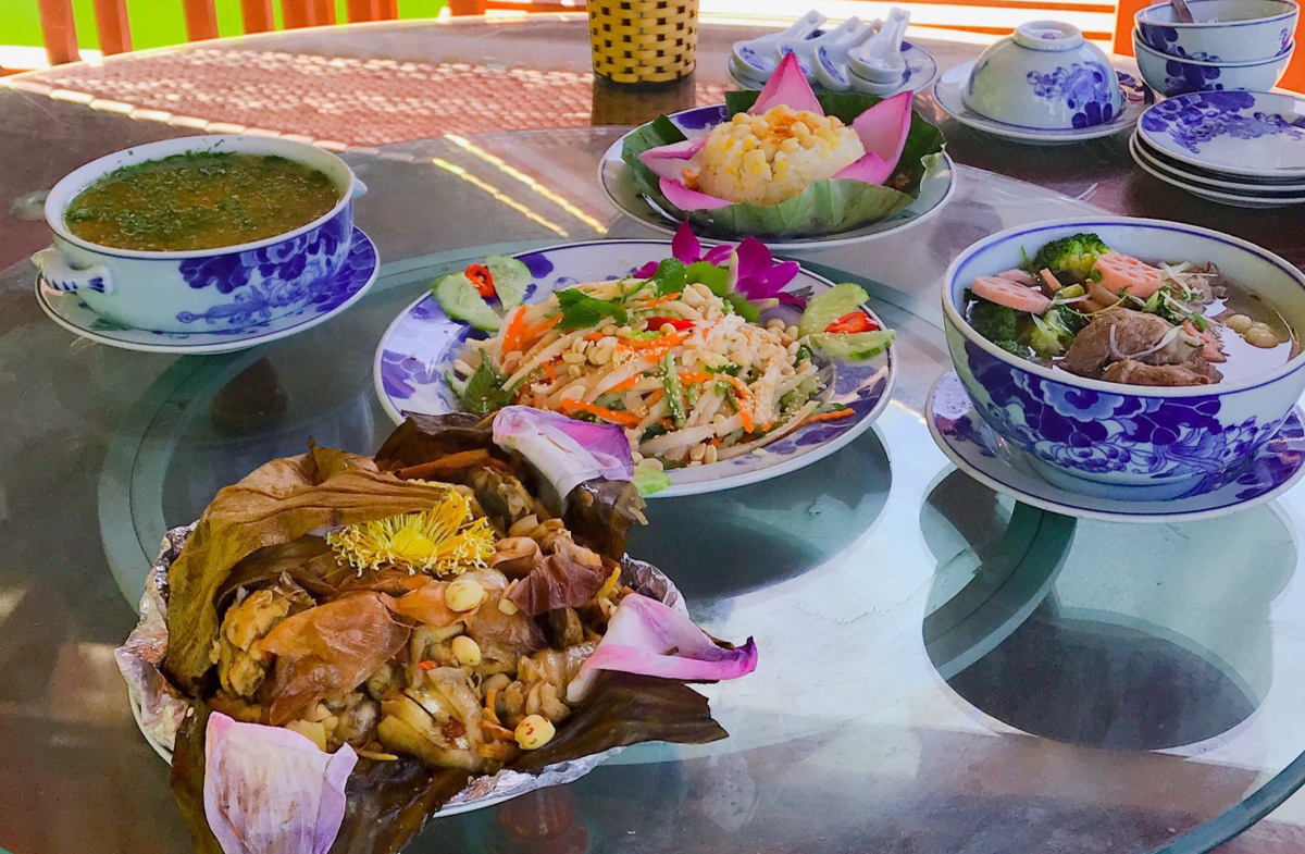 Ngoài ngắm cảnh hồ sen, du khách đến những khu nghỉ dưỡng nói trên có thể thưởng thức các đặc sản làm từ sen. Ví dụ, đến Hali Home, khách có thể thưởng thức củ sen, hạt sen sấy, nộm ngó sen, lẩu sen, xôi sen và được trải nghiệm làm trà sen. Ở Chez Beo, bạn được thưởng thức các món tẩm ướp cùng lá sen như cá nướng lá sen, gà hấp lá sen. Còn ở Hang Múa Ecolodge, đó là nộm ngó sen tai heo, chân giò hầm củ sen, gà nướng lá sen... Ảnh: Hang Múa Ecolodge