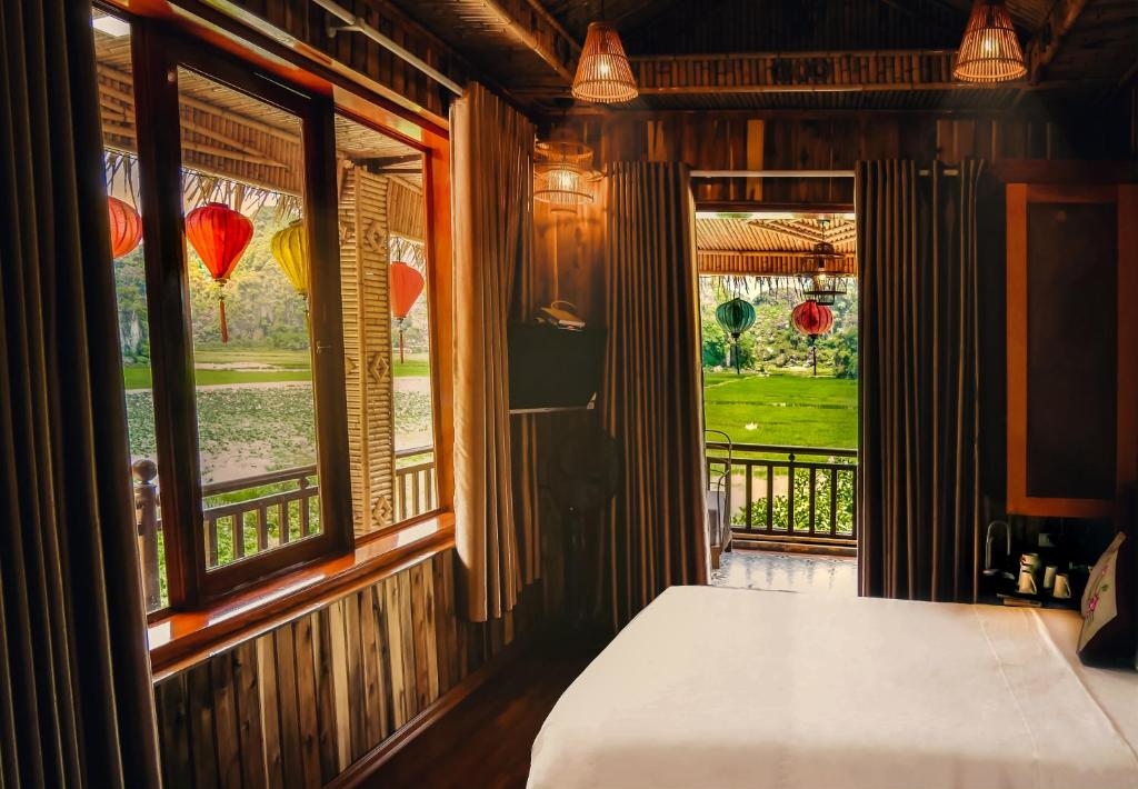 Các phòng có tầm nhìn ra núi đá vôi và cánh đồng lúa, giúp du khách thư giãn, đổi gió sau chuỗi ngày làm việc mệt mỏi. Có 6 loại phòng là villa, bungalow có bể bơi, phòng gia đình với bể bơi riêng, phòng gia đình với ban công, nhà cây, phòng đôi. Giá cho một đêm tại đây vào mùa cao điểm từ 1,3 triệu đồng. Ảnh: Booking
