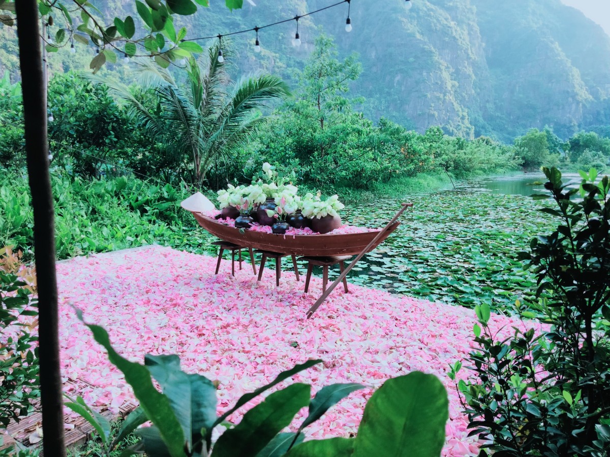Homestay nằm ở trung tâm thung lũng Thung Chẽ với hai bên là hai núi đá vôi cao, nếu chèo lên đỉnh có thể nhìn thấy một bên là Tam Cốc và một bên là Hang Múa (lưu ý phải đi cùng nhân viên homestay). Ngoài hai dãy núi cao, khu nghỉ dưỡng còn được ưu ái khi có một con sông nhỏ chảy men theo chân hai dãy núi. Hầu hết các phòng của homestay đều có con sông này chảy qua. Khu nghỉ cũng cung cấp dịch vụ chèo thuyền thư giãn, câu cá ngay trong khuôn viên. Ảnh: Khu nghỉ dưỡng