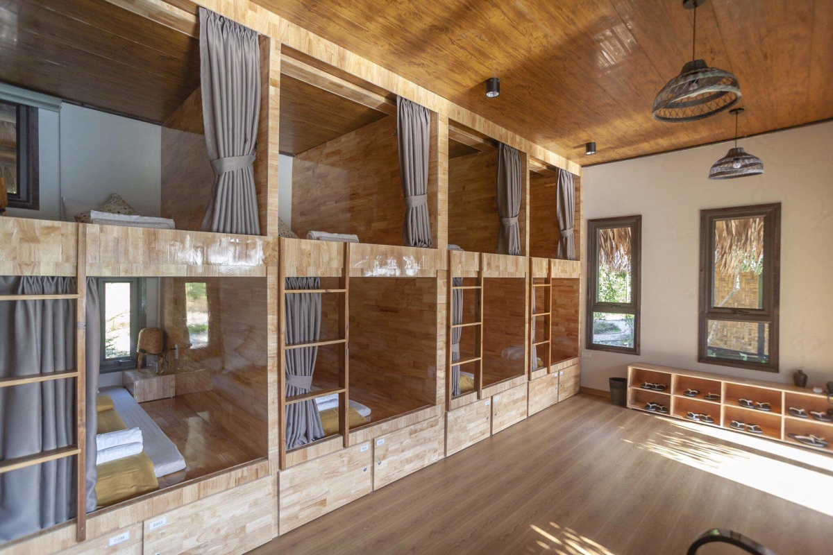 Tại đây có nhiều lựa chọn phòng, trong đó có phòng dorm dành cho khách đi đông người hoặc muốn tiết kiệm chi phí. Các phòng đều lát gỗ, tông màu nhẹ nhàng, tạo cảm giác mát mẻ vào mùa hè. Giá phòng đôi, đơn ở đây là 750.000 đồng vào ngày thường và chủ nhật, các ngày thứ 5, 6 và 7 có giá 1 triệu đồng. Phòng dorm có giá từ 280.000 đến 380.000 đồng một khách. Ảnh: Booking