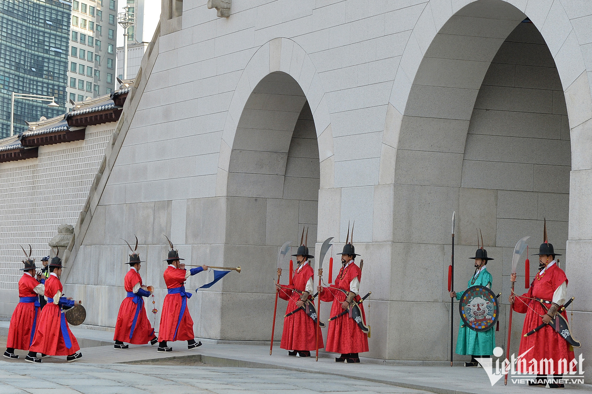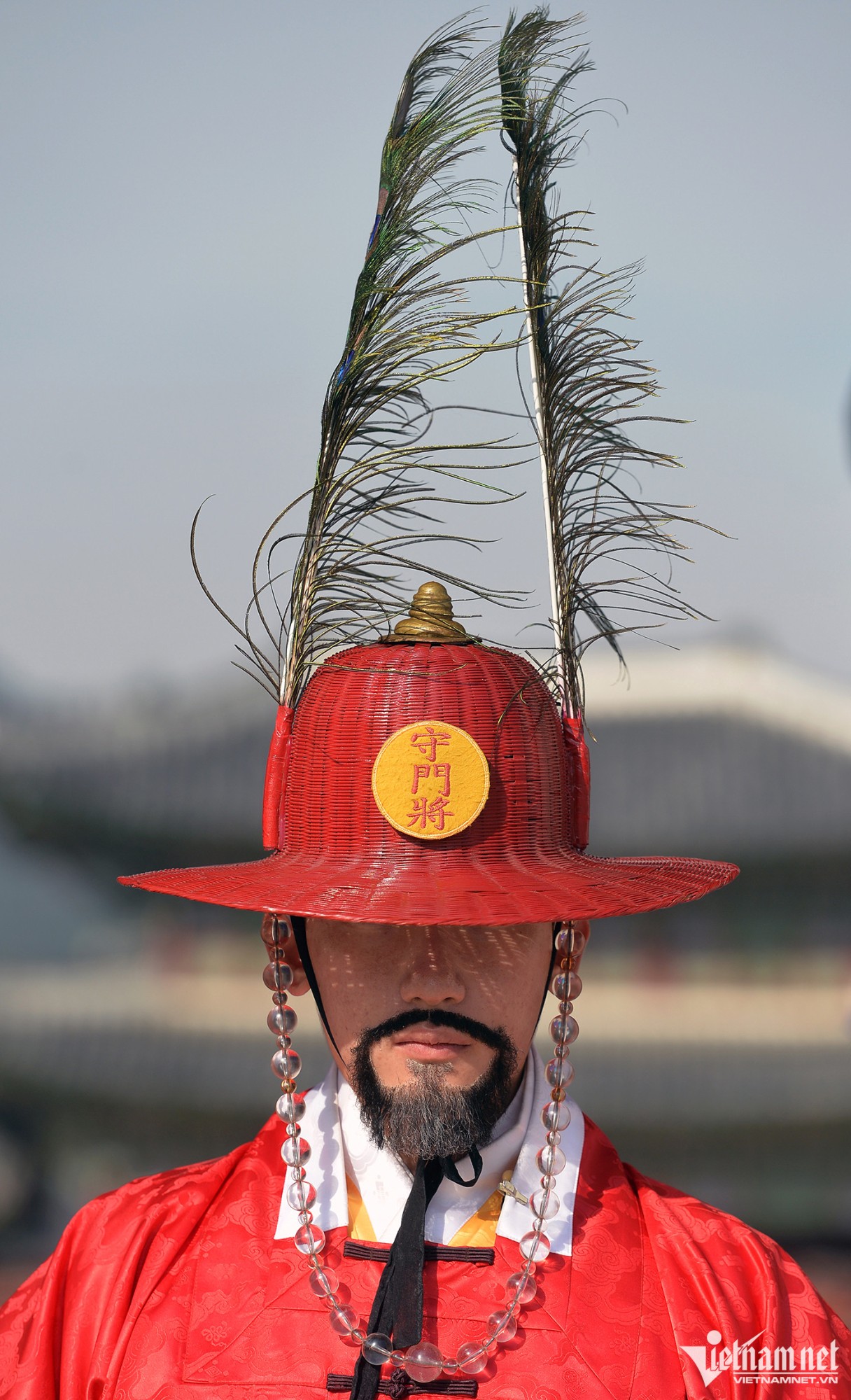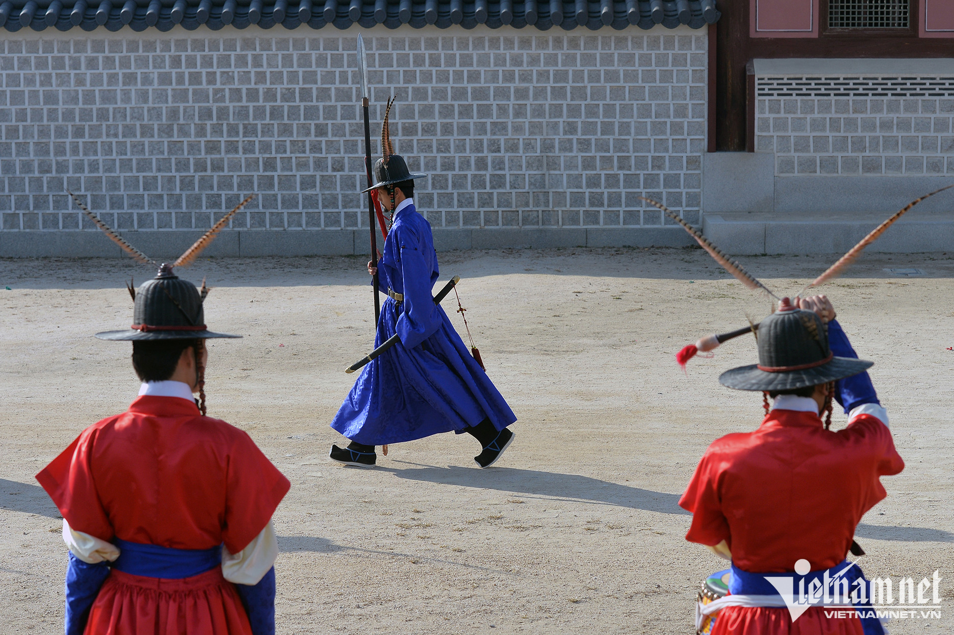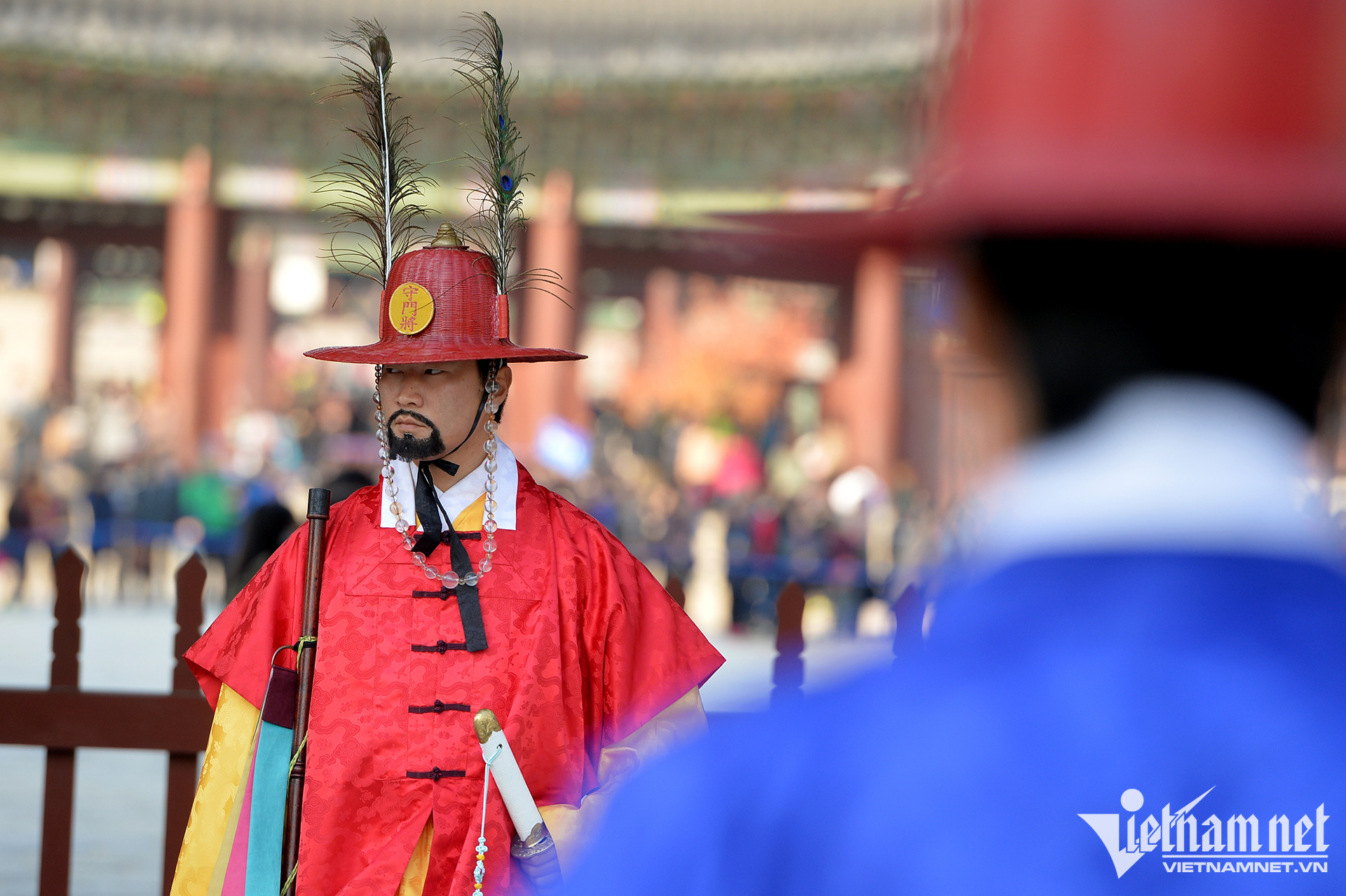 Lính canh Hoàng gia mặc phục trang giống như thời Joseon bước ra từ phía sau của cung. Du khách có thể phân biệt tướng và lính qua trang phục. Trong ảnh, vị trấn tướng đội mũ đỏ luôn đứng trong tư thế oai nghiêm, mắt nhìn thẳng về phía trước, chỉ cử động khi cần đi lại để chỉ đạo.